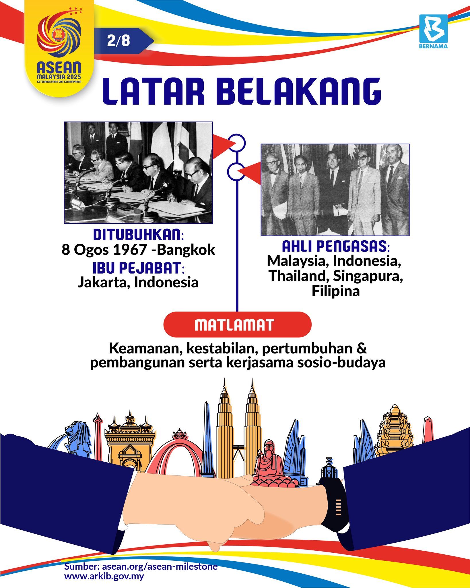 Sejak penubuhannya pada 8 Ogos 1967, Asean telah berkembang daripada lima negara pengasas menjadi sebuah blok serantau yang memainkan peranan penting dalam memelihara keamanan dan kemakmuran Asia Tenggara.