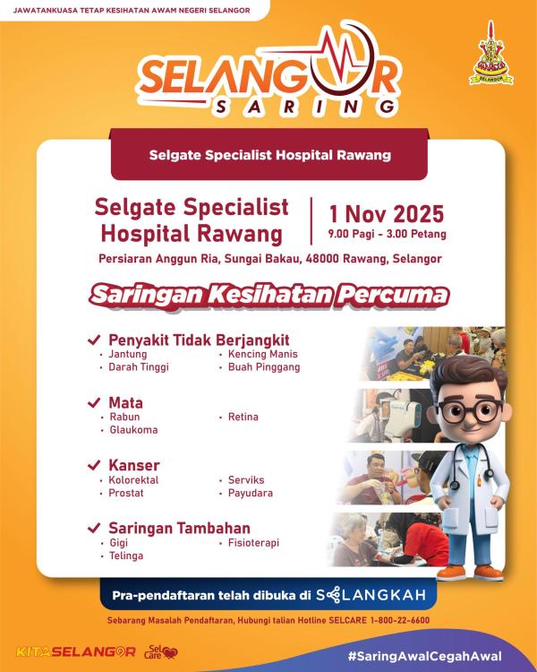 SHAH ALAM, 31 OKT: Orang ramai dipelawa menyertai program Selangor Saring yang menawarkan pelbagai pemeriksaan kesihatan secara percuma di Selgate Specialist Hospital Rawang (SSH), esok.