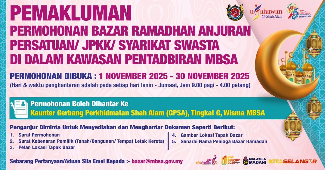 SHAH ALAM, 1 NOV: Majlis Bandaraya Shah Alam (MBSA) mempelawa permohonan bagi penganjuran Bazar Ramadan Tahun 2026 oleh persatuan, Jawatankuasa Pembangunan dan Keselamatan Kampung (JPKK) dan syarikat swasta di kawasan pentadbirannya.