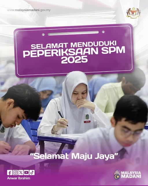 SHAH ALAM, 3 NOV: Perdana Menteri mengucapkan selamat maju jaya kepada calon Sijil Pelajaran Malaysia (SPM) 2025 yang bermula hari ini.