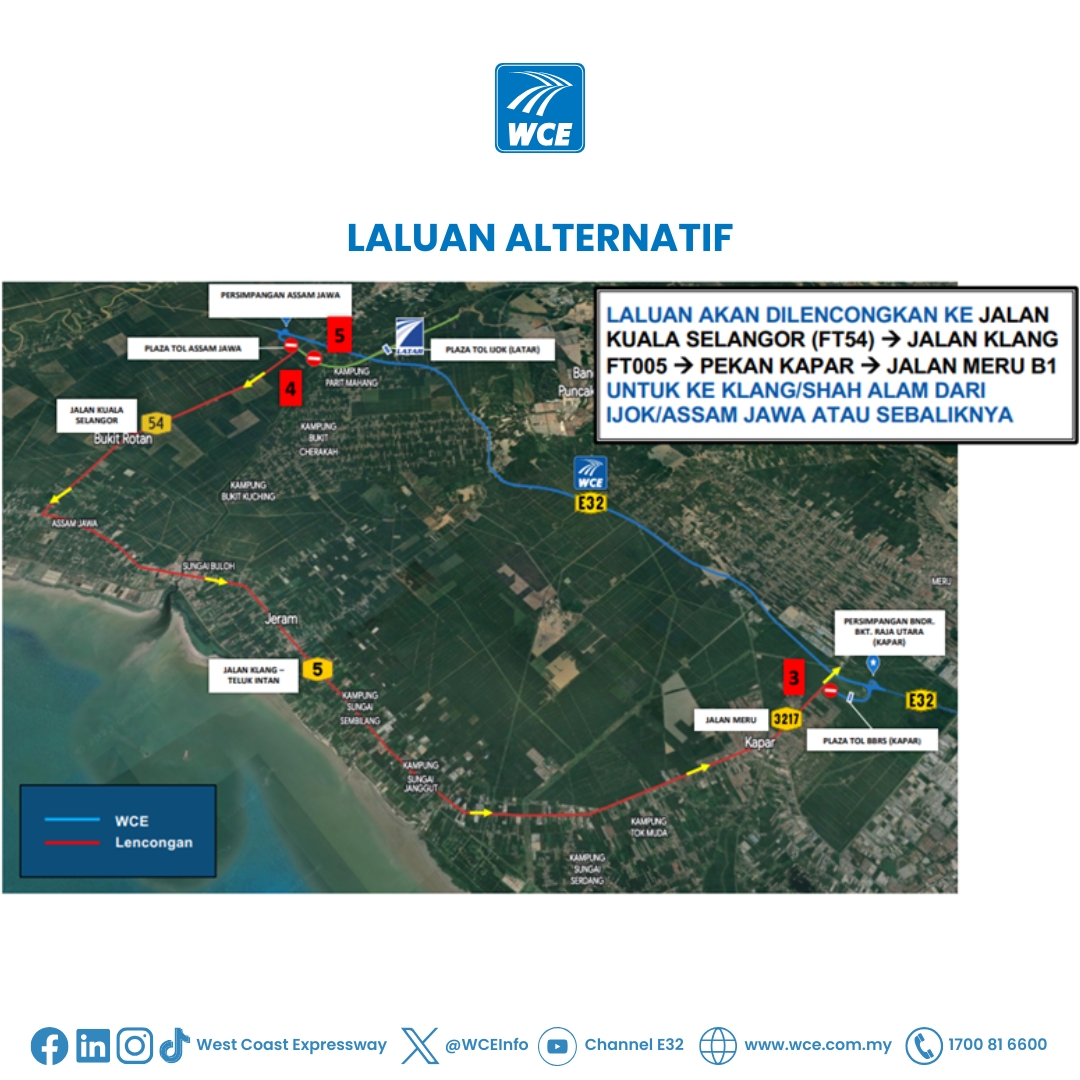 Orang ramai turut disaran menggunakan laluan alternatif yang disediakan serta merujuk laman rasmi WCE untuk maklumat terkini mengenai pelaksanaan penutupan berkenaan.