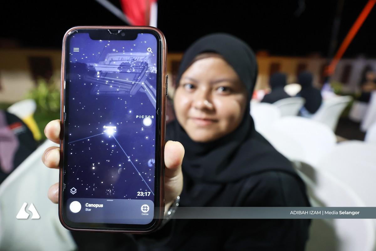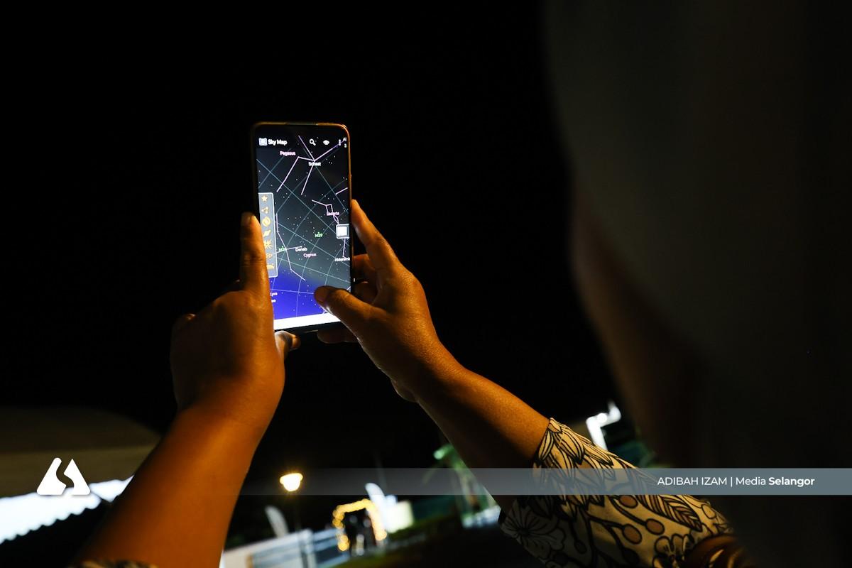 Seorang peserta mencuba aplikasi skyview lite ketika Stargazing Mobile astrophotography anjuran SABDA di Balai Cerap Sungai Lang Sabak Bernam.