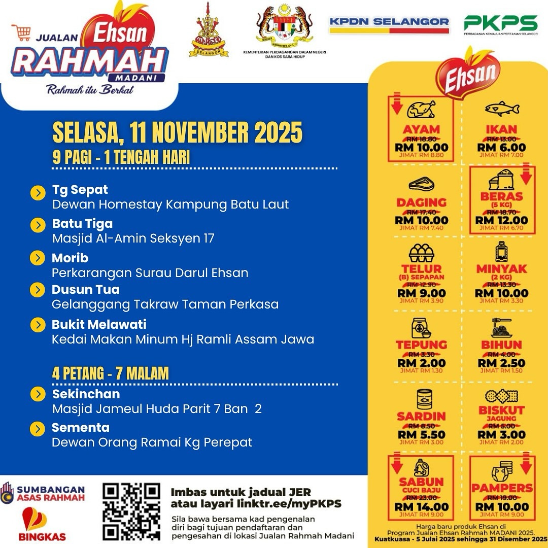 SHAH ALAM, 10 NOV: Program Jualan Ehsan Rahmah (JER) kendalian Perbadanan Kemajuan Pertanian Selangor (PKPS) dan Kementerian Perdagangan Dalam Negeri dan Kos Sara Hidup (KPDN) diteruskan ke tujuh lokasi esok.