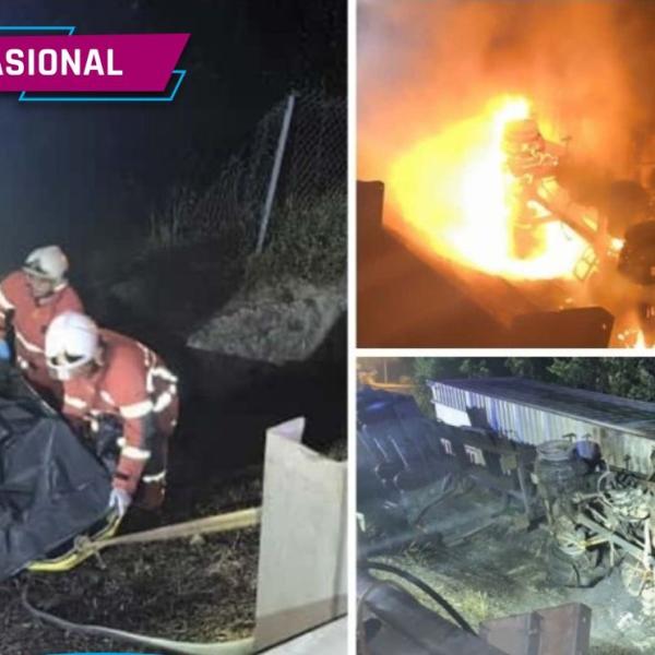 "Kebakaran melibatkan sebuah kontena sejuk beku yang membawa muatan sayur-sayuran, dipercayai terbabas ke tepi jalan sebelum terbakar.