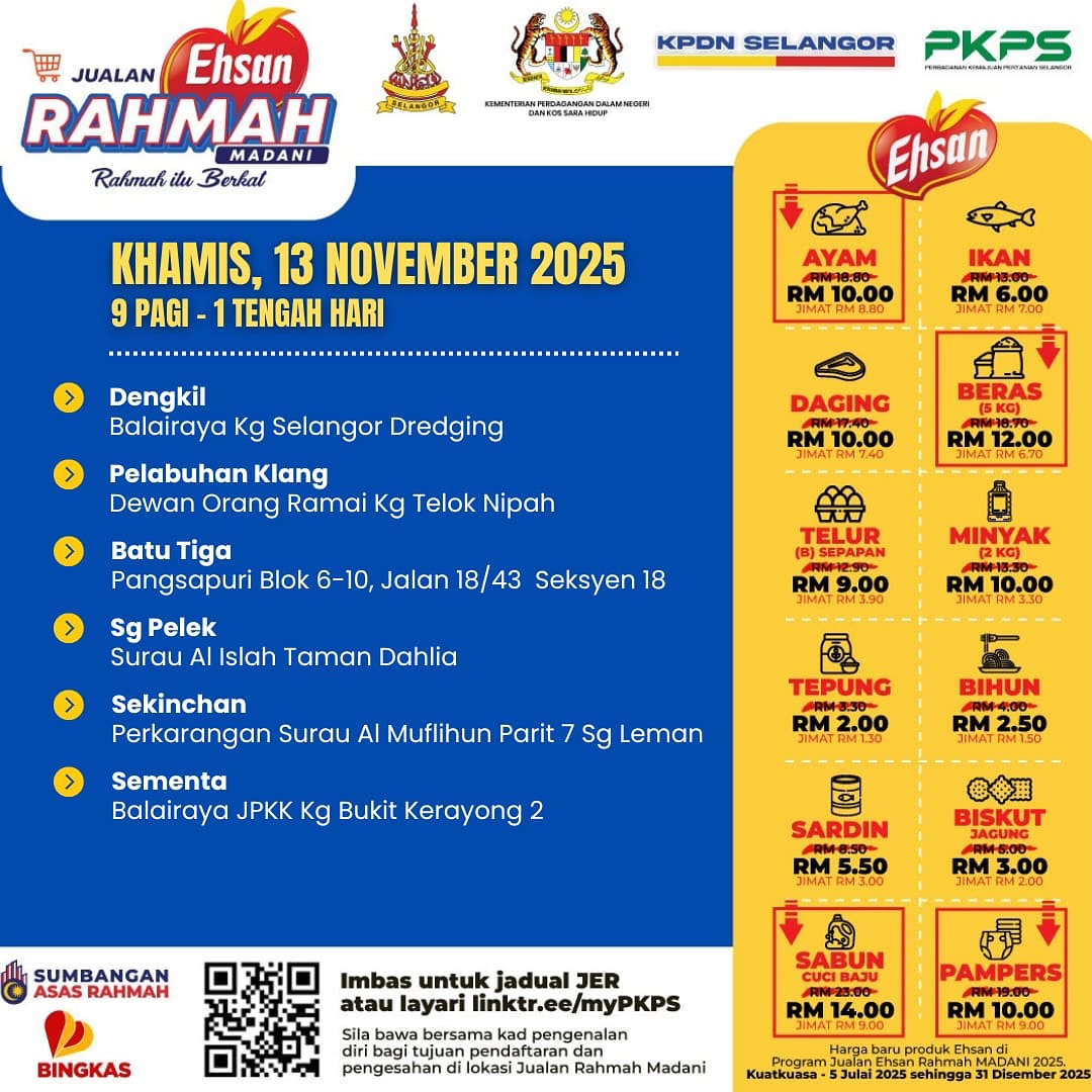 SHAH ALAM, 13 NOV: Program Jualan Ehsan Rahmah (JER) kendalian Perbadanan Kemajuan Pertanian Selangor (PKPS) serta Kementerian Perdagangan Dalam Negeri dan Kos Sara Hidup (KPDN) diteruskan ke enam lokasi hari ini.