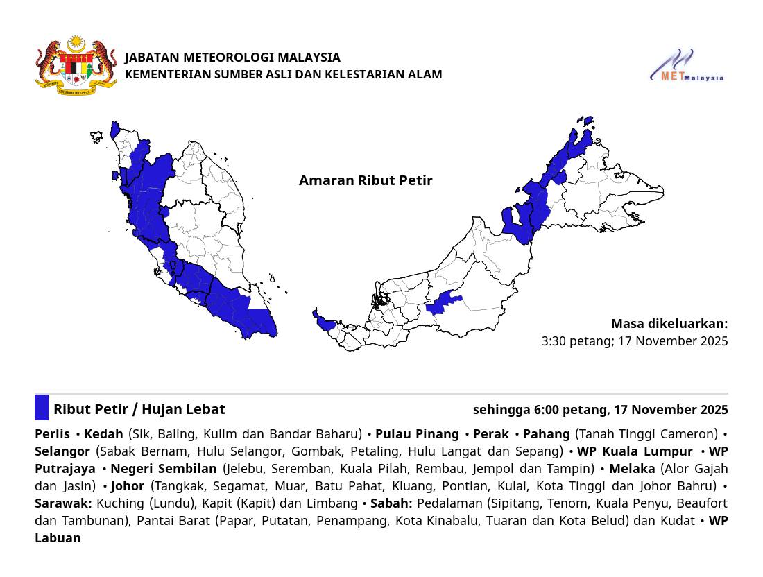 SHAH ALAM, 17 NOV: Jabatan Meteorologi Malaysia (METMalaysia) mengeluarkan amaran ribut petir melibatkan beberapa negeri di Semenanjung, Sarawak, Sabah dan Labuan sehingga jam 6 petang ini.