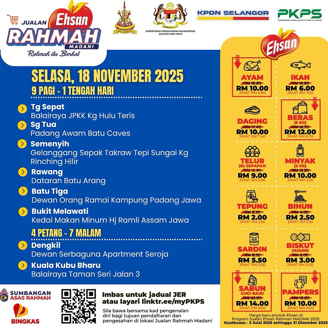 SHAH ALAM, 18 NOV: Program Jualan Ehsan Rahmah (JER) kendalian Perbadanan Kemajuan Pertanian Selangor (PKPS) serta Kementerian Perdagangan Dalam Negeri dan Kos Sara Hidup (KPDN) diteruskan di lapan lokasi hari ini.