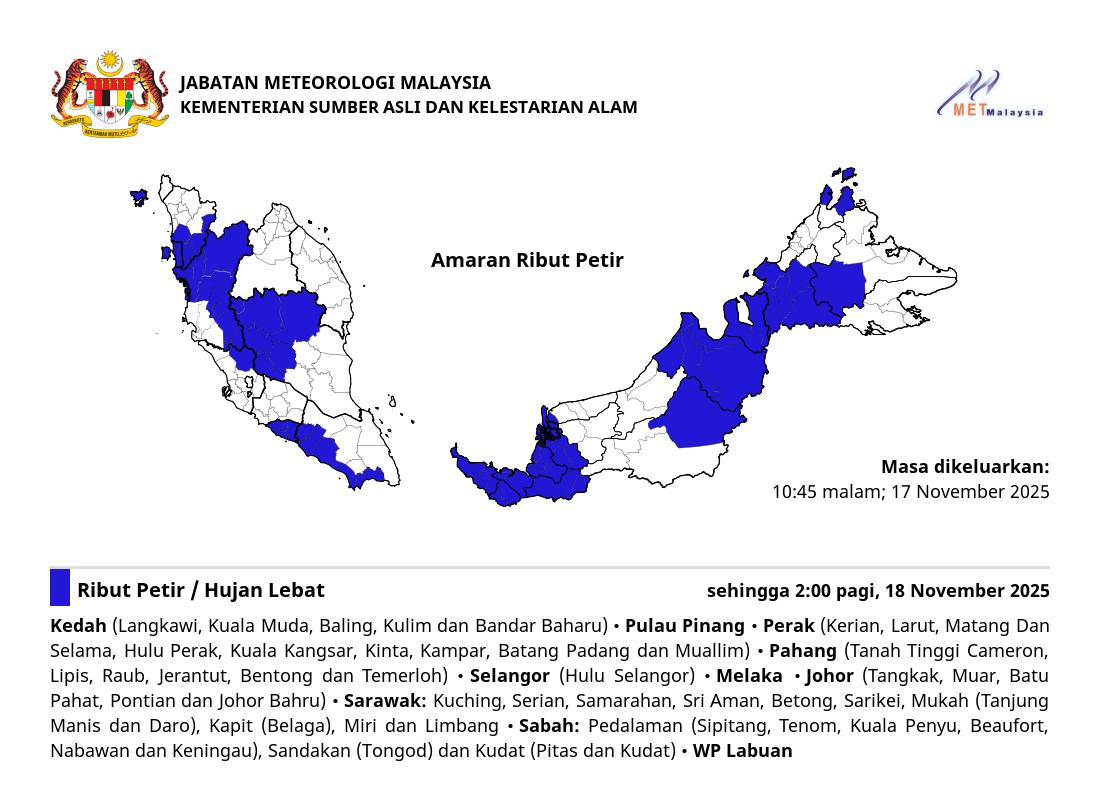 KUALA LUMPUR, 17 NOV: Jabatan Meteorologi Malaysia (MetMalaysia) mengeluarkan amaran ribut petir, hujan lebat dan angin kencang membabitkan beberapa negeri sehingga jam 2 pagi ini.