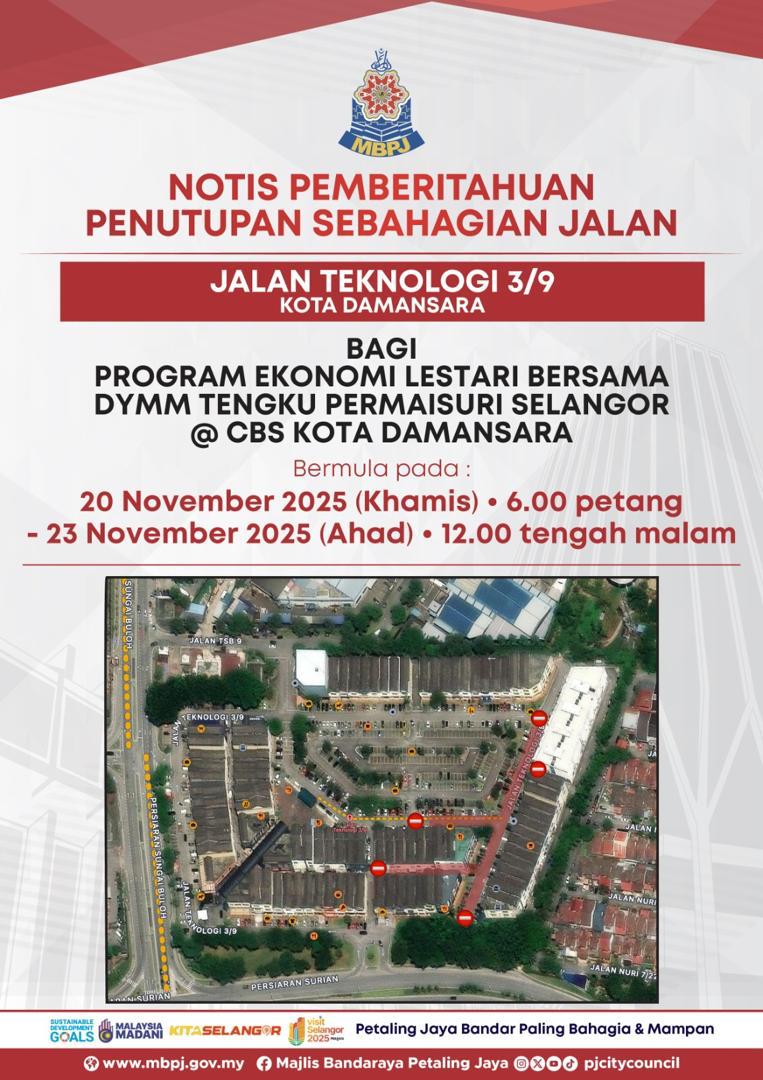 SHAH ALAM, 19 NOV: Sebahagian laluan di Jalan Teknologi 3/9, Kota Damansara akan ditutup mulai esok bagi memberi laluan kepada persiapan dan penganjuran program Ekonomi Lestari yang bakal dihadiri Duli Yang Maha Mulia Tengku Permaisuri Selangor.