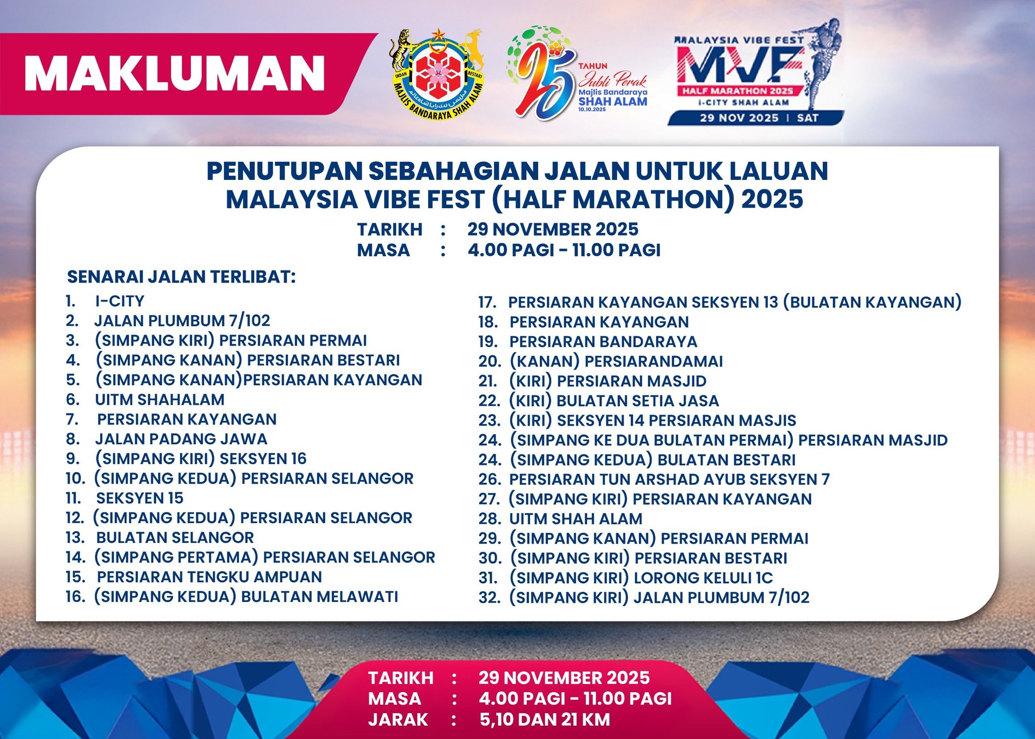 SHAH ALAM, 20 NOV: Beberapa laluan utama di sekitar Shah Alam akan ditutup secara berperingkat sempena penganjuran Malaysia Vibe Fest (Half Marathon) 2025 pada 29 November ini.