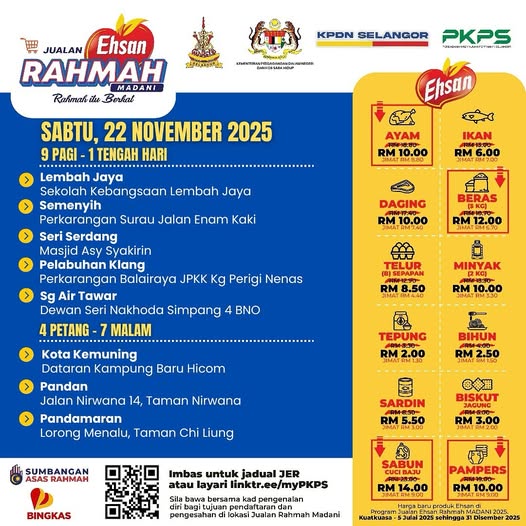 SHAH ALAM, 22 NOV: Program Jualan Ehsan Rahmah (JER) kendalian Perbadanan Kemajuan Pertanian Selangor (PKPS) dan Kementerian Perdagangan Dalam Negeri dan Kos Sara Hidup (KPDN) diteruskan ke lapan lokasi, hari ini.