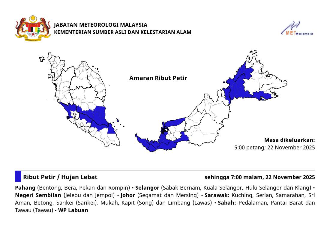 SHAH ALAM, 22 NOV: Jabatan Meteorologi Malaysia (MetMalaysia) meramalkan hujan lebat dan ribut petir melanda Sabak Bernam, Kuala Selangor, Hulu Selangor dan Klang hingga 7 malam ini.