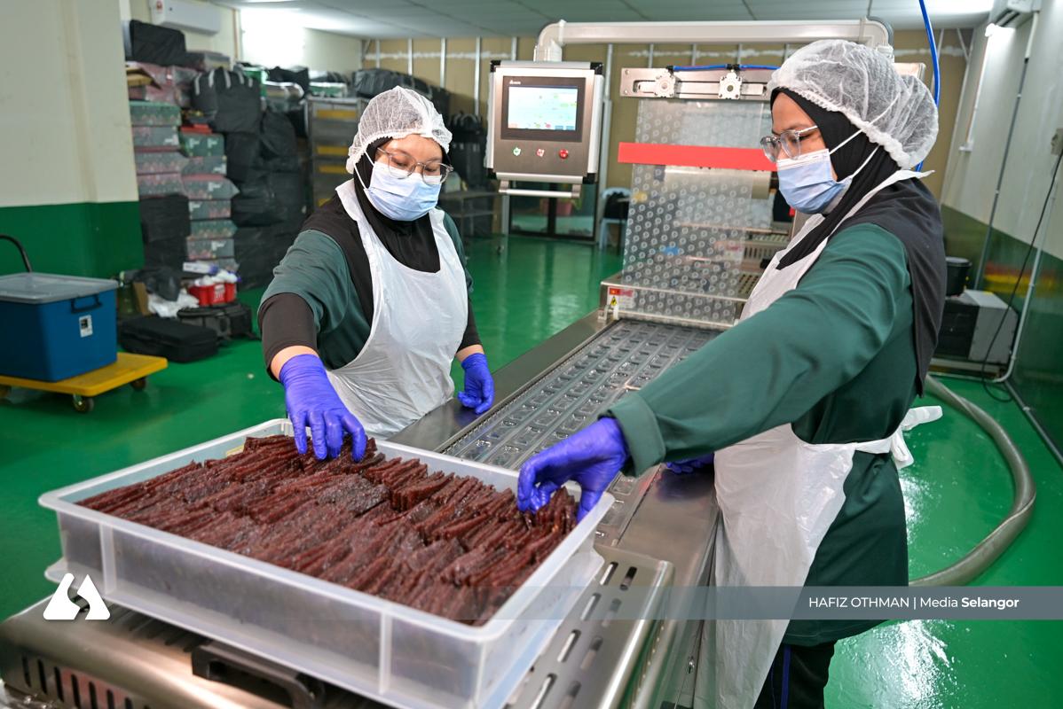 Pekerja sedang melakukan proses menyalai daging. Setiap kepingan dikawal dengan teliti untuk memastikan kualiti konsisten sebelum dibungkus.