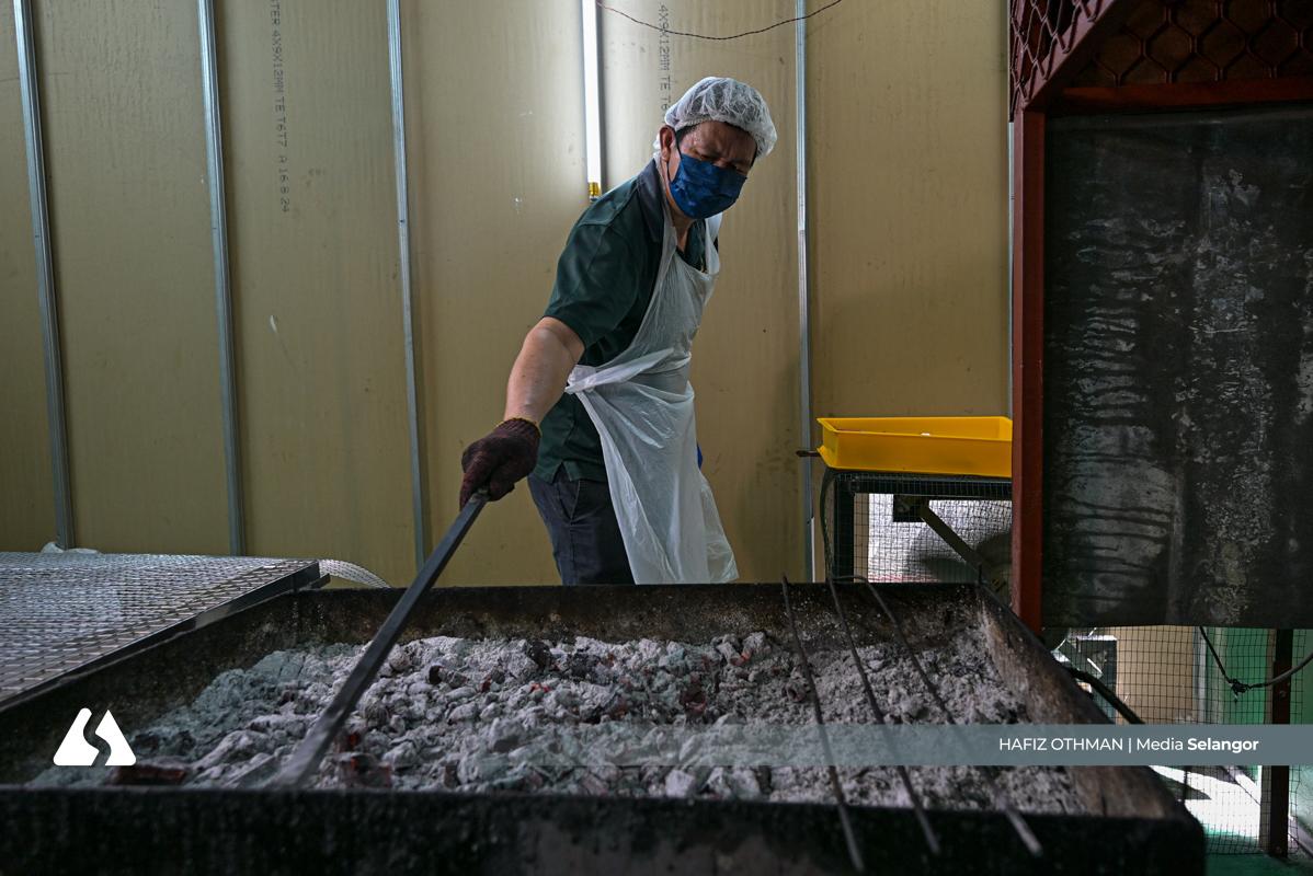 Pekerja sedang menyalakan bara api sebelum memulakan proses menyalai daging.