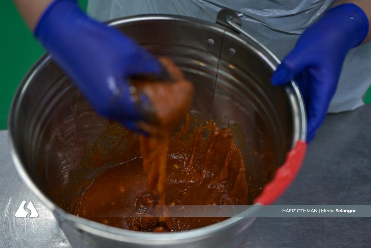 Seorang pekerja menyediakan adunan rempah perapan, mencampurkan setiap bahan mengikut resipi yang ditetapkan sebelum digaul bersama daging. Proses ini menjadi nadi kepada aroma dan rasa yang menentukan identiti produk.