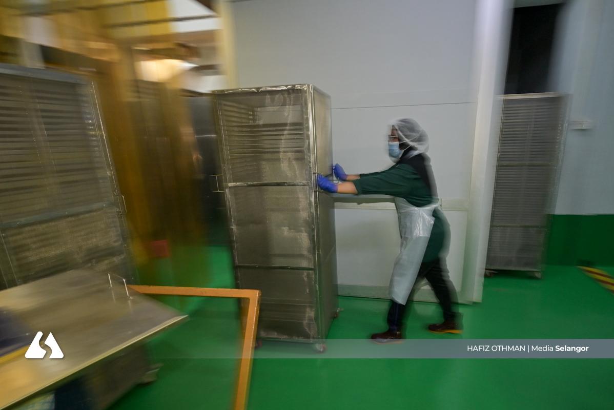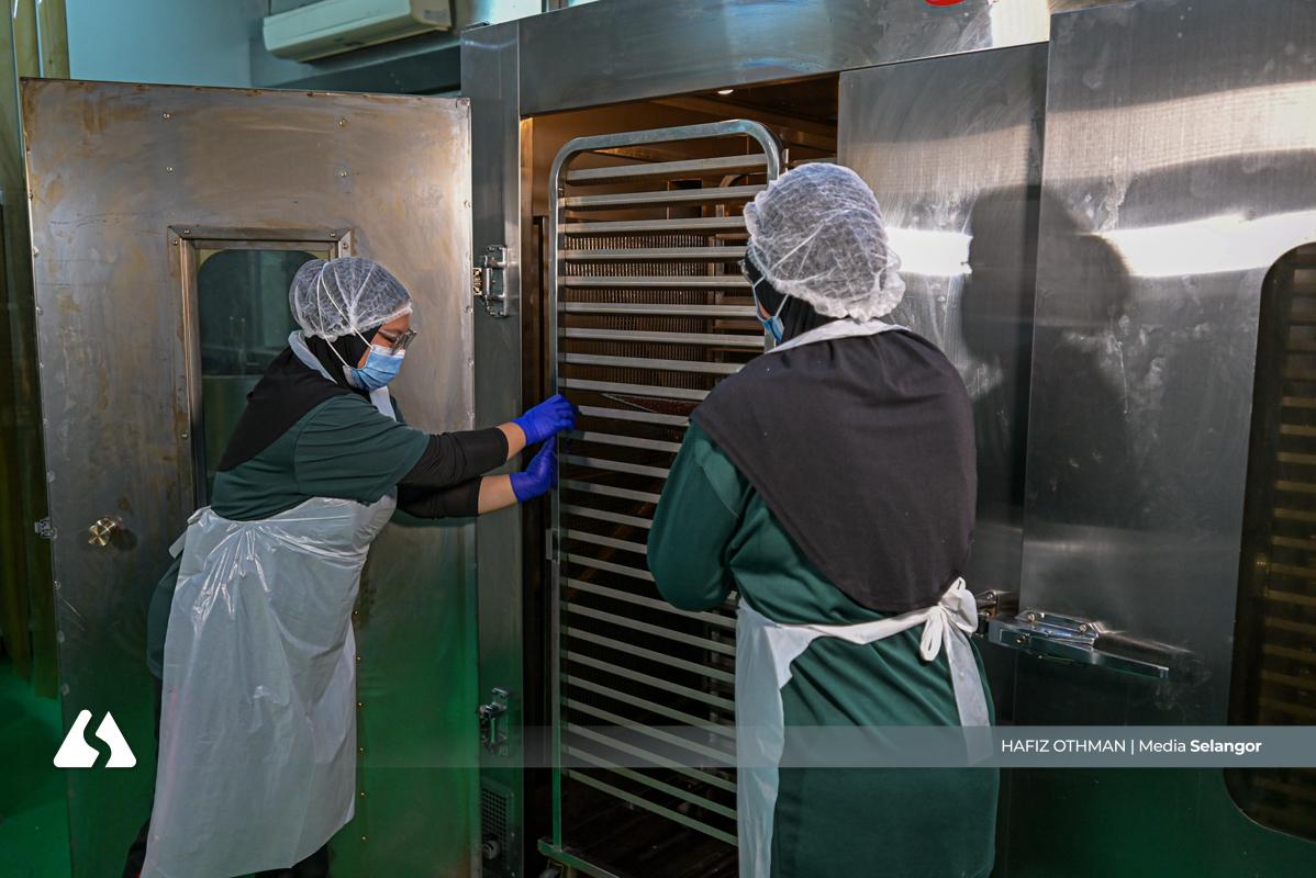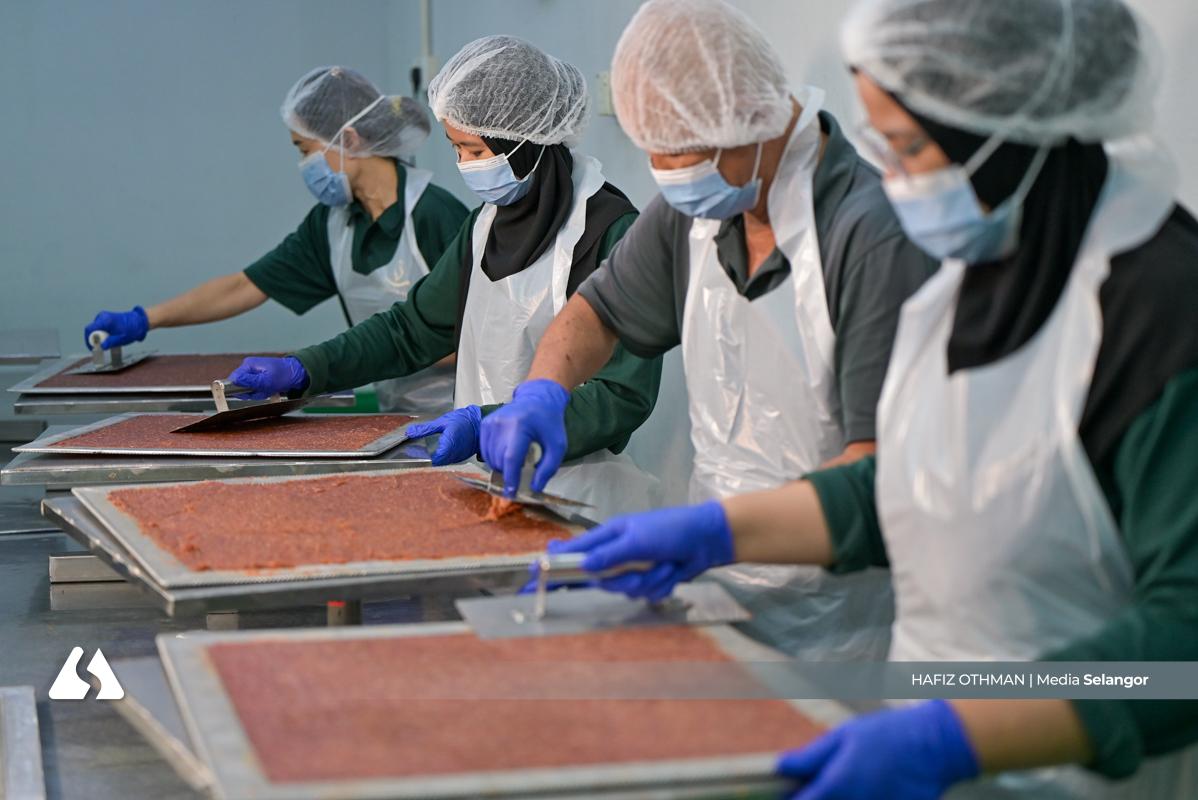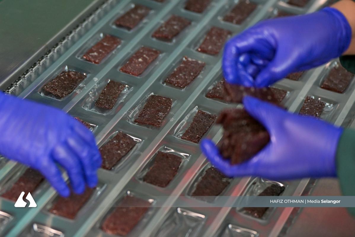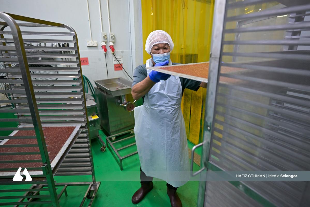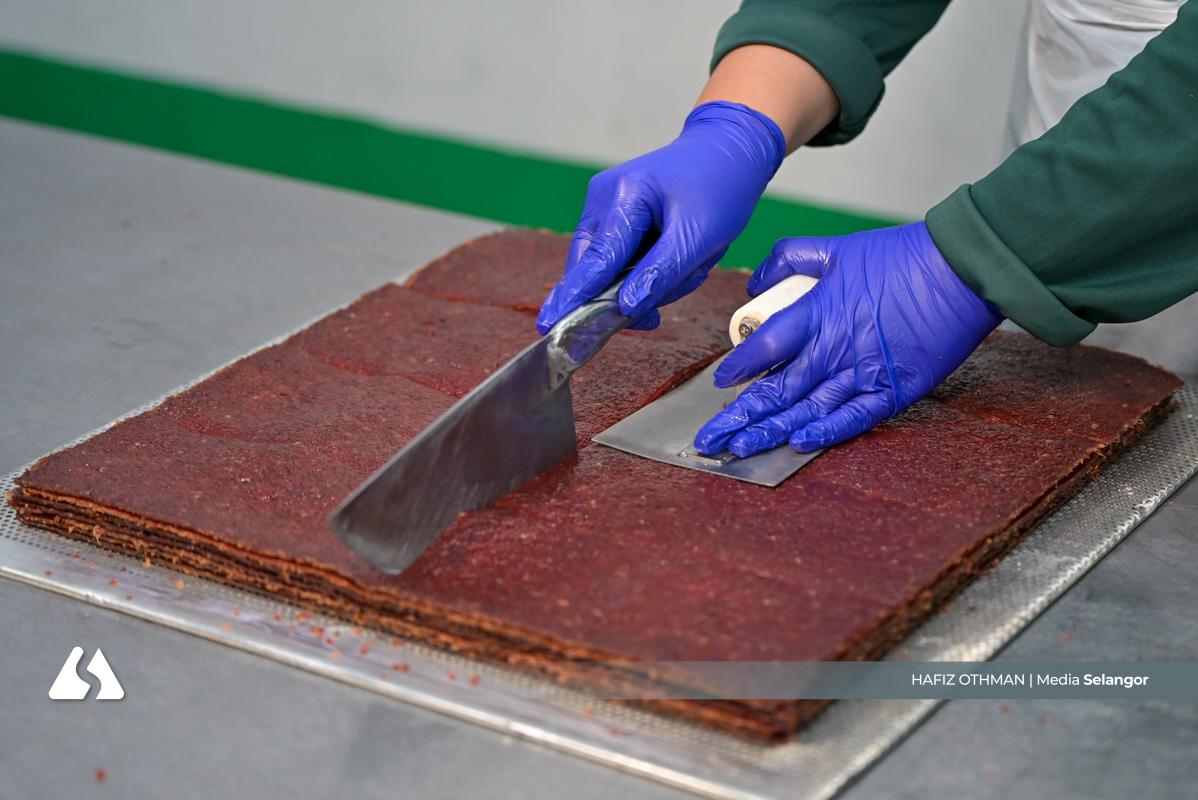 Kepingan daging yang keluar dari oven dipotong menjadi bentuk empat segi, memastikan setiap bahagian seragam sebelum melalui proses seterusnya. Ketelitian ini penting bagi mengekalkan standard kualiti setiap produk.