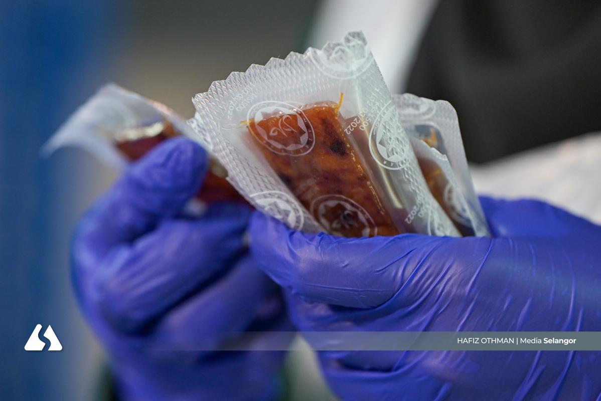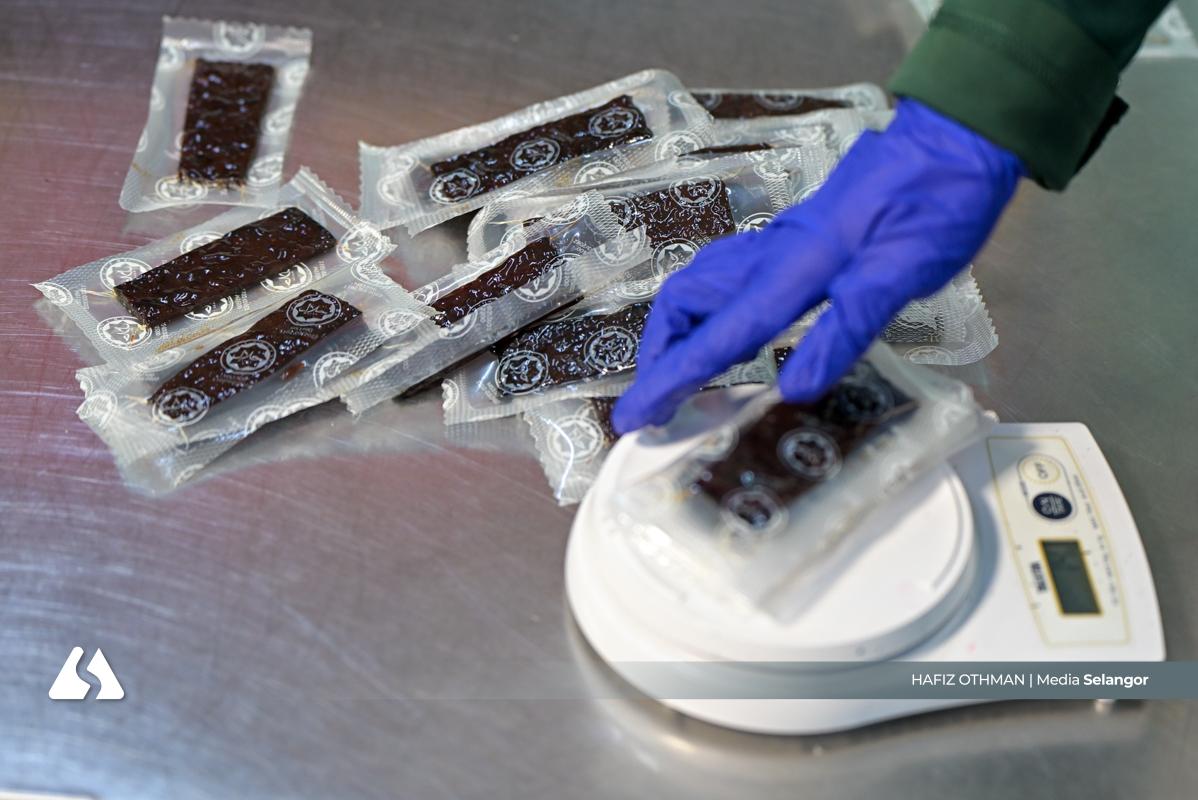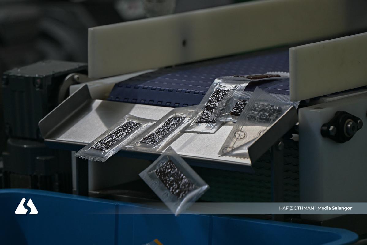 Kakitangan Tawakkal Food menjalankan proses pembungkusan menggunakan mesin khas, memastikan setiap produk dibungkus rapi dan bersedia untuk pengedaran.