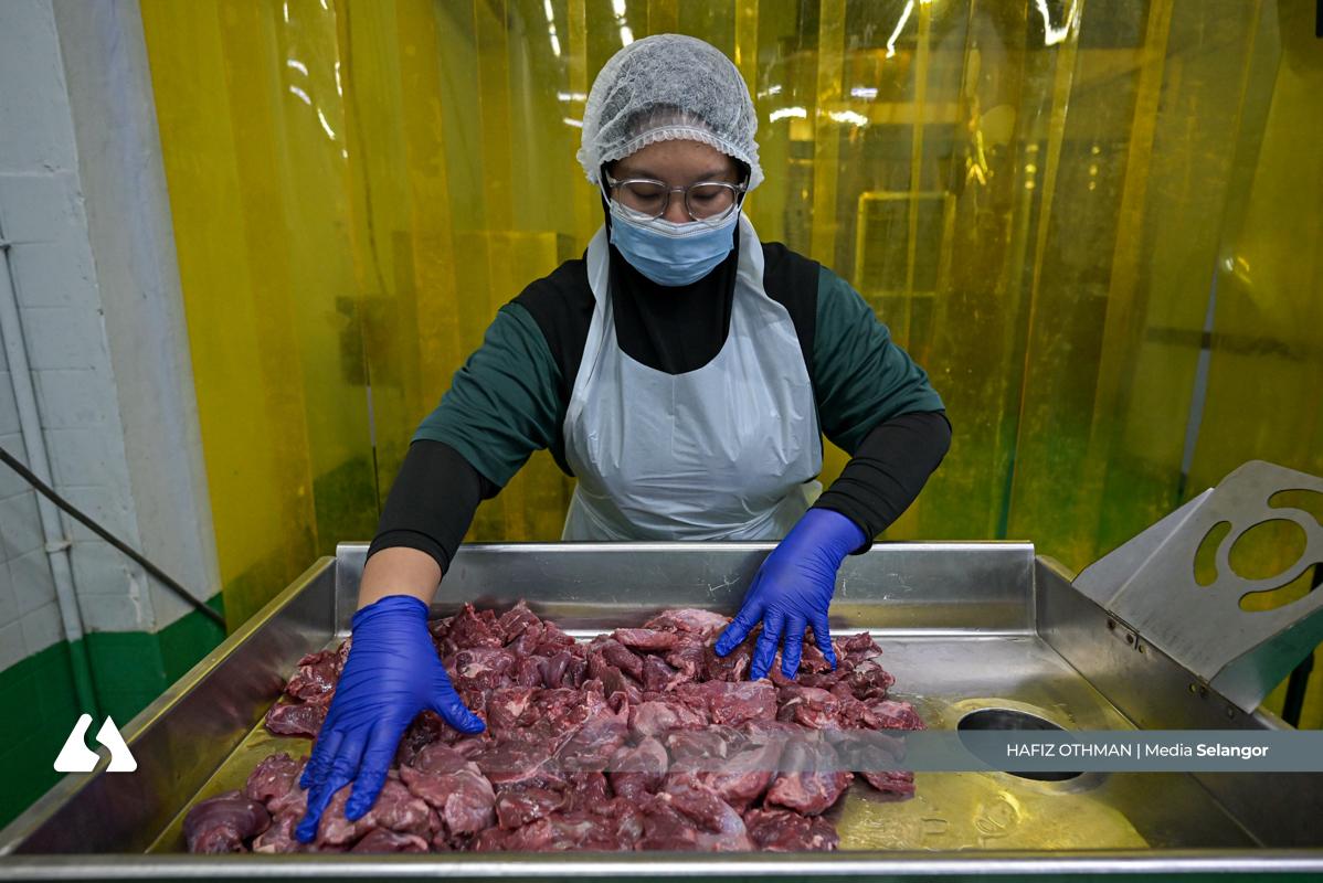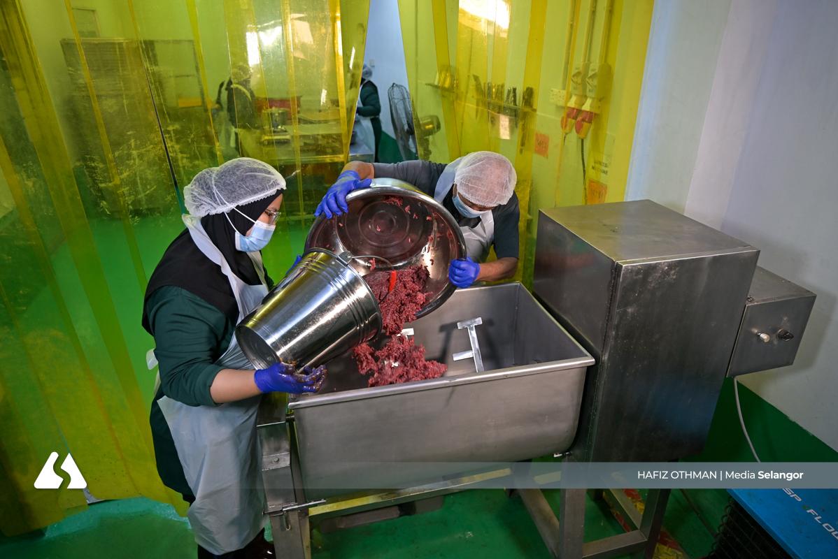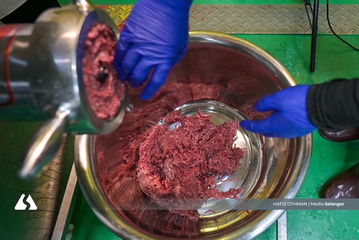 Seorang pekerja menata potongan daging di atas mesin pengisar, memulakan proses kisaran yang menjadi asas kepada tekstur dan rasa produk akhir. Setiap langkah dilakukan teliti bagi penghasilan makanan yang berkualiti.