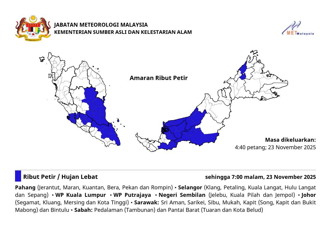 Amaran sama turut melibatkan Kuala Lumpur dan Putrajaya, selain beberapa kawasan di negeri lain termasuk Pahang, Negeri Sembilan, Johor, Sarawak dan Sabah.