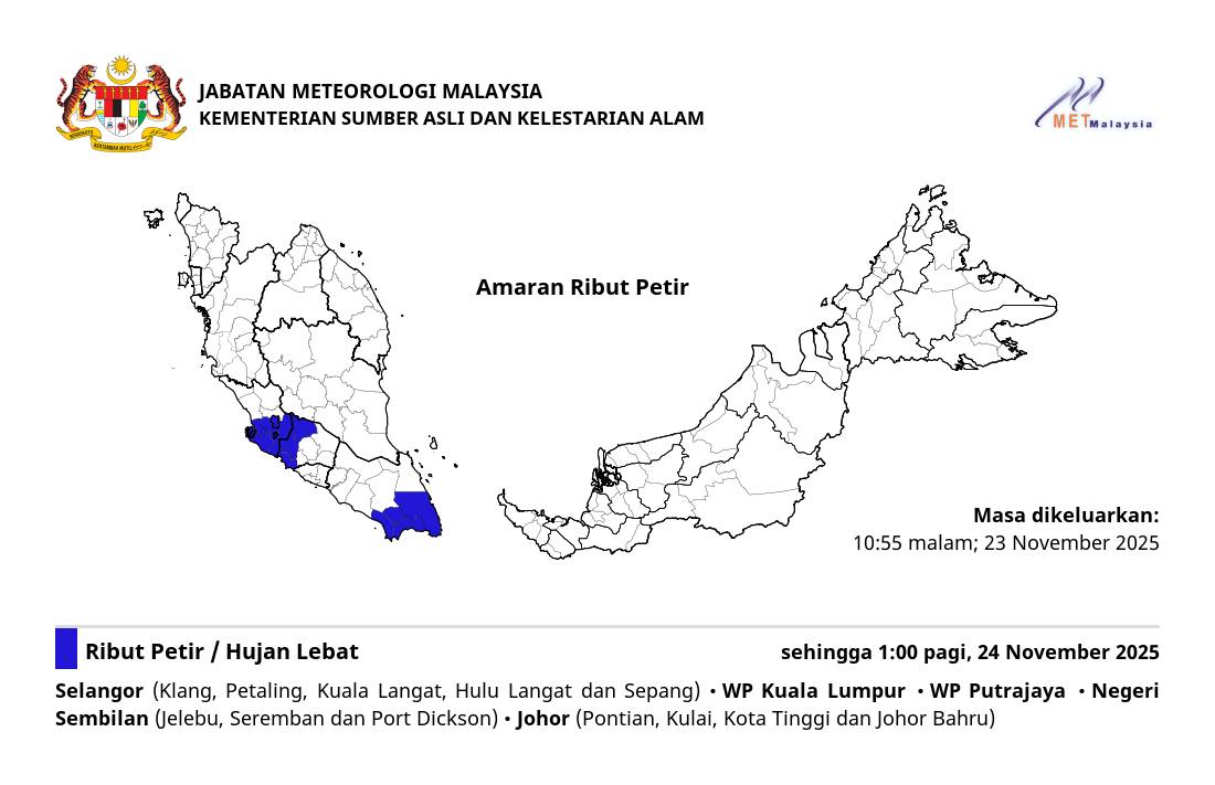 MetMalaysia menerusi Facebook memaklumkan, amaran sama turut melibatkan Kuala Lumpur, Putrajaya, Negeri Sembilan (Jelebu, Seremban, Port Dickson) serta Johor (Pontian, Kulai, Kota Tinggi, Johor Bahru).