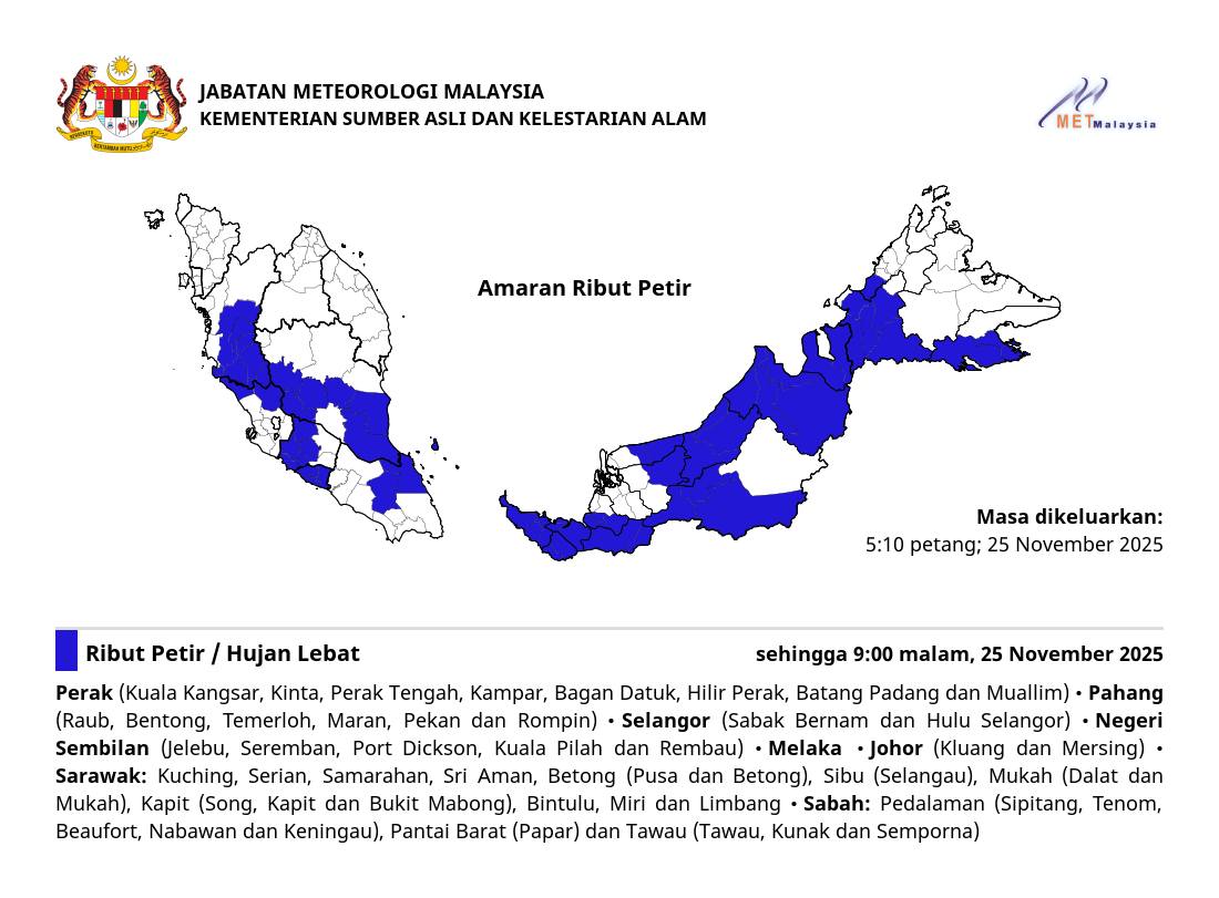 SHAH ALAM, 25 NOV: Jabatan Meteorologi Malaysia (MetMalaysia) mengeluarkan amaran ribut petir, hujan lebat dan angin kencang di Sabak Bernam dan Hulu Selangor, sehingga jam 9 malam ini.