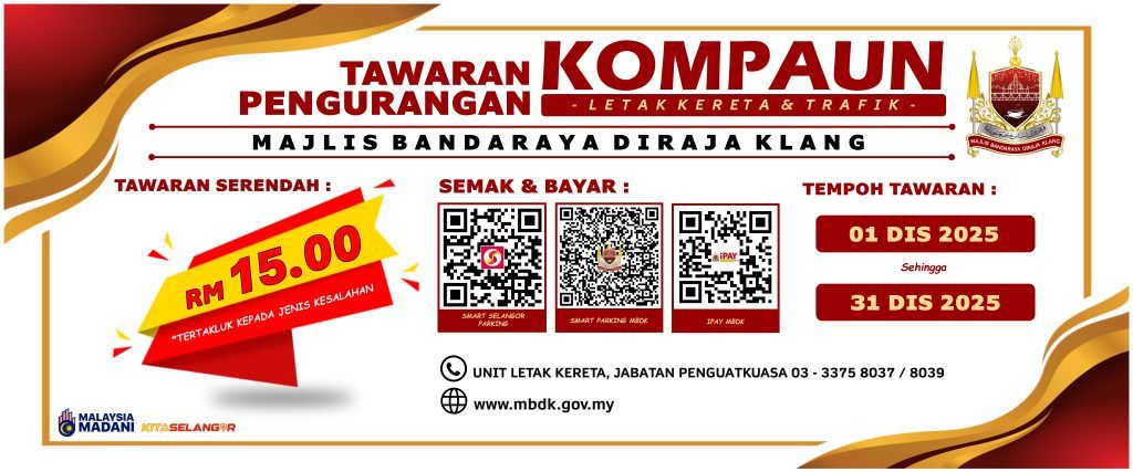SHAH ALAM, 28 NOV: Orang ramai berpeluang menyelesaikan tunggakan kompaun parkir Majlis Bandaraya Diraja Klang (MBDK) dengan kadar serendah RM15 sepanjang Disember ini.