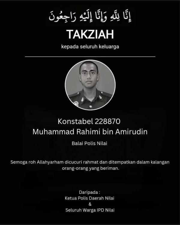 SHAH ALAM, 30 NOV: Seorang anggota polis dari Balai Polis Nilai, Muhamad Rahimi Amirudin, 23, ditemui lemas kira-kira jam 7.30 pagi tadi selepas dihanyutkan arus deras di Kampung Giching malam Jumaat lalu.