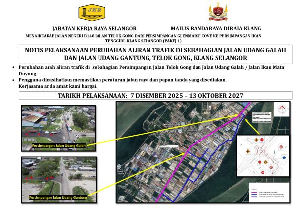 SHAH ALAM, 5 DIS: Berlaku perubahan aliran trafik di sebahagian Jalan Udang Galah dan Jalan Udang Gantung, Telok Gong, Klang bermula 7 Disember ini sehingga 13 Oktober 2027.