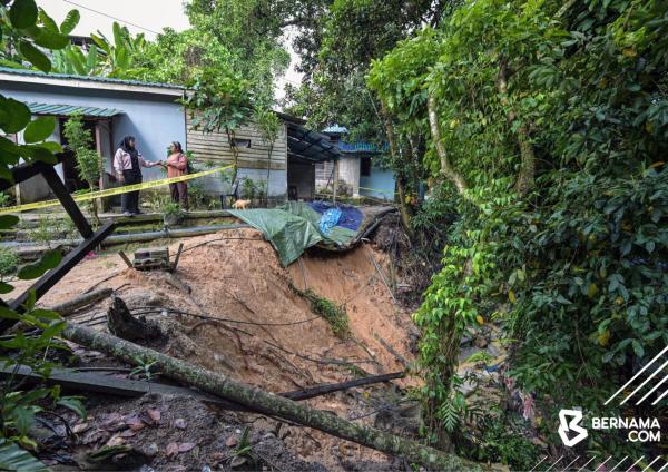 GOMBAK, 5 DIS: Seorang warga emas melalui detik cemas apabila dinding dapurnya runtuh dan sebahagian rumahnya hampir terjatuh ke tebing, susulan tanah runtuh akibat hujan lebat di Kampung Orang Asli Batu di sini Rabu lepas.