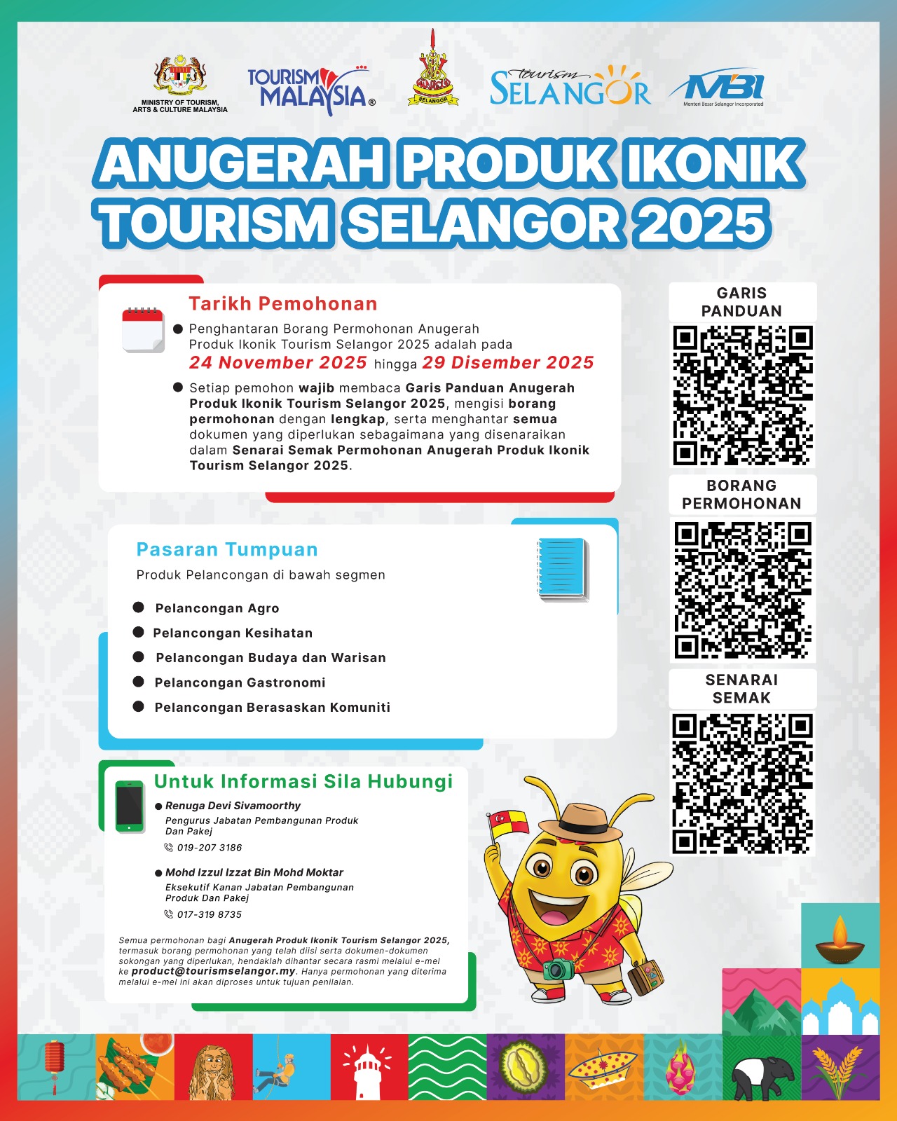 SHAH ALAM, 8 DIS: Tourism Selangor membuka penilaian Produk Pelancongan Ikonik Selangor 2025 sehingga 29 Disember ini melibatkan lima kategori iaitu Pelancongan Agro, Pelancongan Perubatan, Pelancongan Budaya & Warisan, Pelancongan Gastronomi (Makanan) serta Pelancongan Berasaskan Komuniti.