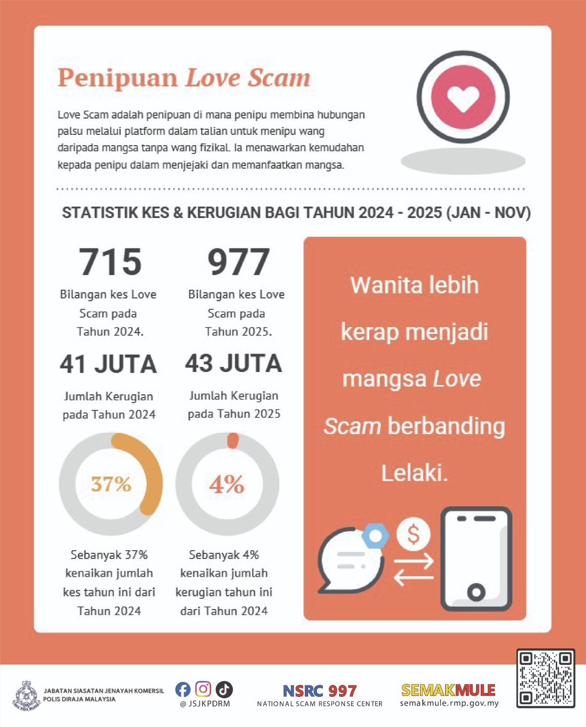 Menurut Jabatan Siasatan Jenayah Komersil (JSJK), jumlah kerugian yang dilaporkan juga meningkat kepada RM43 juta, berbanding RM41 juta pada 2024.