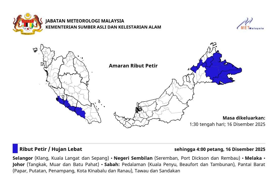 SHAH ALAM, Jabatan Meteorologi Malaysia (MetMalaysia) mengeluarkan amaran ribut petir dan hujan lebat di daerah Klang, Kuala Langat dan Sepang di Selangor hingga 4 petang.