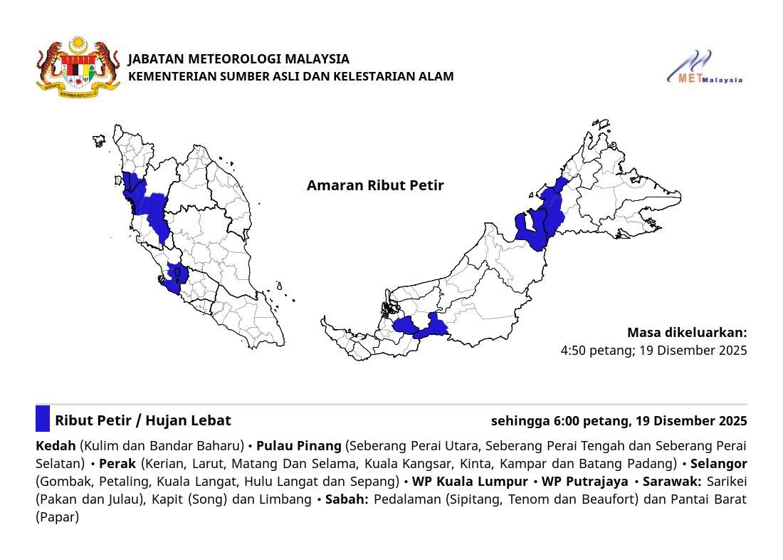 METMalaysia memaklumkan, amaran cuaca itu melibatkan Gombak, Petaling, Kuala Langat, Hulu Langat dan Sepang.