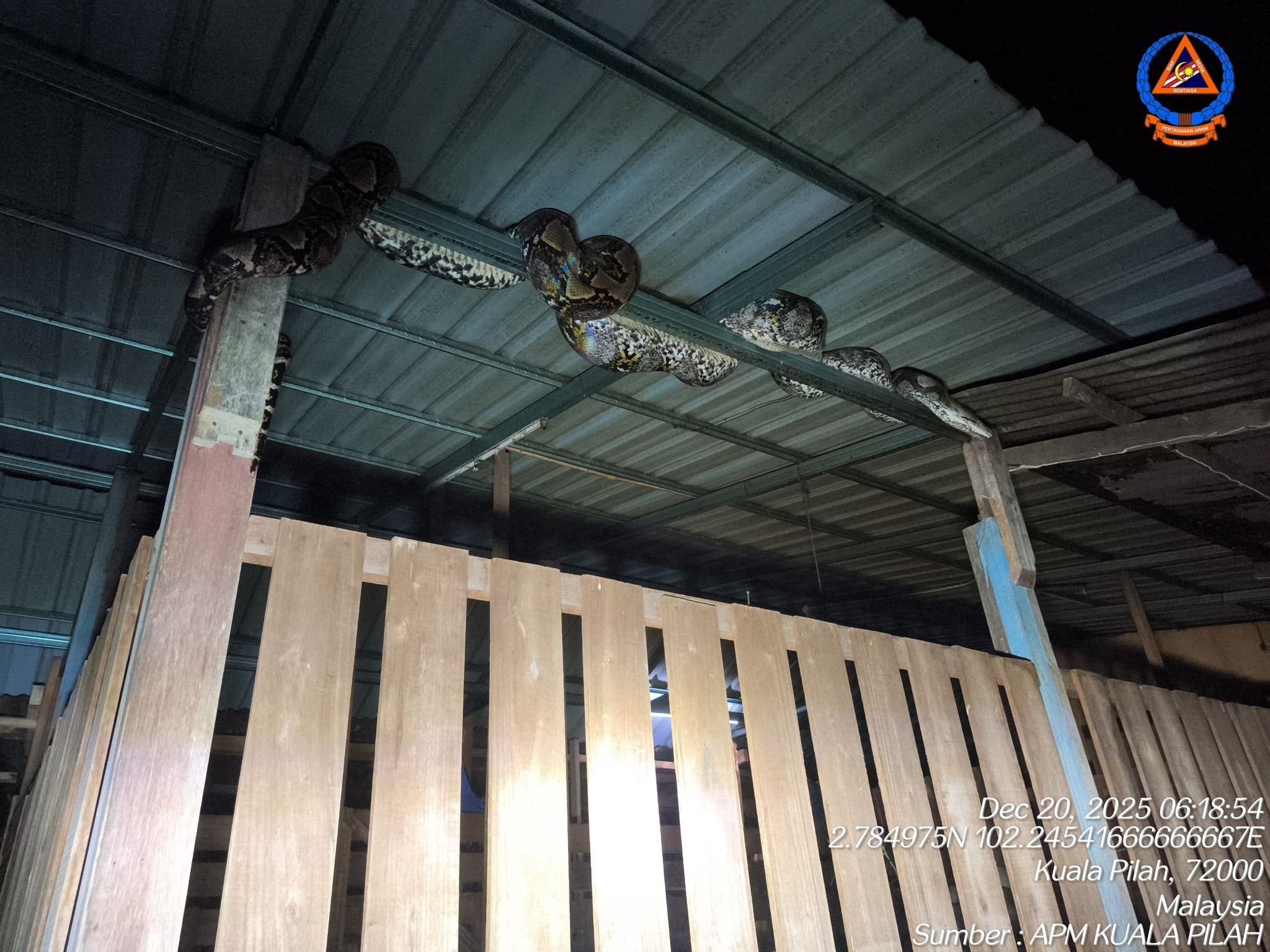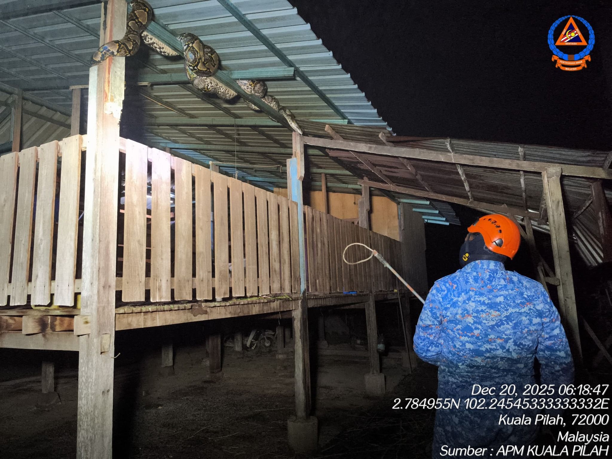 SHAH ALAM, 21 DIS: Angkatan Pertahanan Awam Malaysia (APM) Kuala Pilah berjaya menangkap seekor ular sawa batik bersaiz besar dalam satu operasi di Kampung Beting, semalam.
