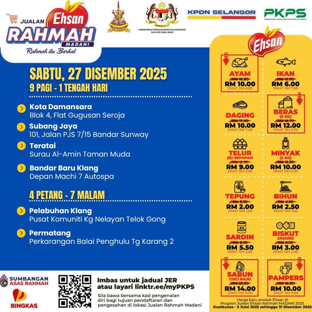 SHAH ALAM, 27 DIS: Program Jualan Ehsan Rahmah (JER) kendalian Perbadanan Kemajuan Pertanian Selangor (PKPS) bersama Kementerian Perdagangan Dalam Negeri dan Kos Sara Hidup (KPDN) diteruskan di enam lokasi hari ini.
