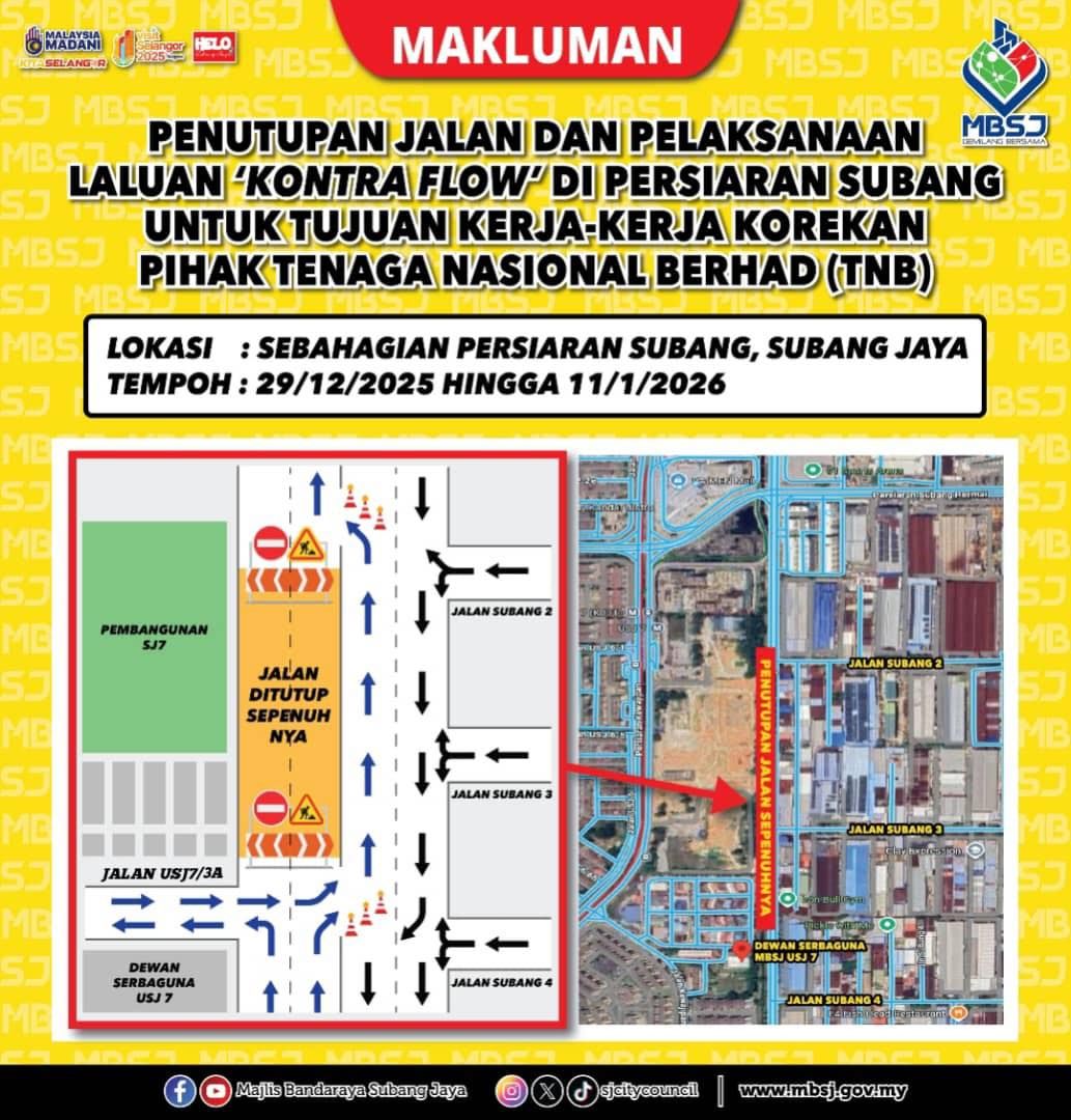 Majlis Bandaraya Subang Jaya (MBSJ) memaklumkan, pelaksanaan penutupan itu turut melibatkan pengenalan laluan kontra (contra flow) dari persimpangan USJ 7/3A hingga persimpangan Jalan Subang 2 bagi memastikan kelancaran aliran trafik di kawasan terlibat.