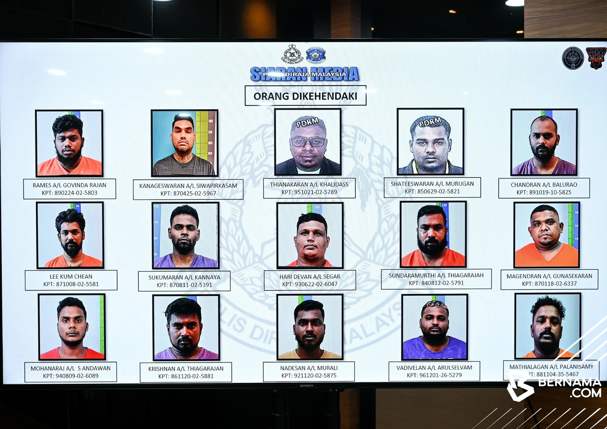 “Operasi ini berjaya menahan 17 ahli kumpulan berumur antara 24 hingga 42 tahun. Semakan rekod mendapati semua suspek mempunyai rekod jenayah lampau termasuk kes bunuh, rompakan bersenjata, mendatangkan kecederaan parah dan pengedaran dadah,” katanya pada sidang media di Ibu Pejabat JSJ Bukit Aman, di sini, hari ini.