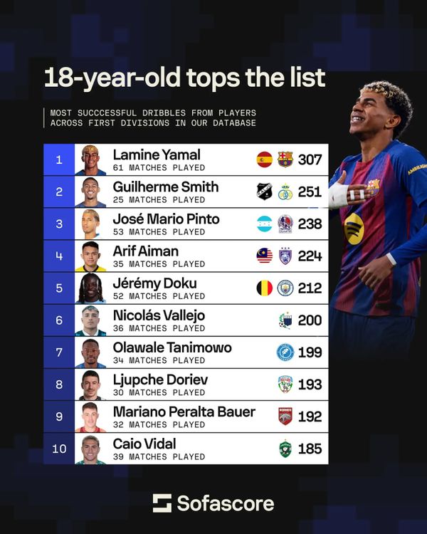 Dalam senarai tersebut, bintang Barcelona dari Sepanyol, Lamine Yamal mendahului carta dengan 307 gelecekan dalam 61 perlawanan, diikuti pemain Union Saint-Gilloise, Guilherme Smith yang mencatat 251 gelecekan dalam 25 perlawanan.