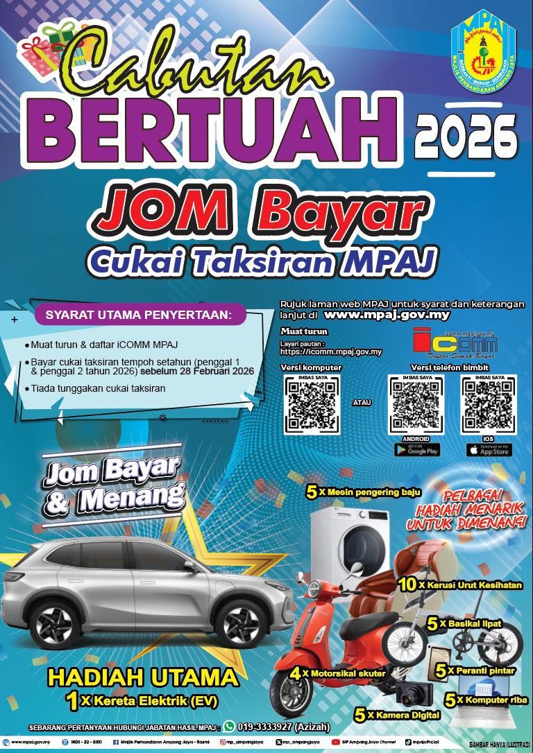 SHAH ALAM, 6 JAN: Pembayar cukai taksiran Majlis Perbandaran Ampang Jaya (MPAJ) berpeluang memenangi sebuah Kereta Elektrik (EV) jika menyertai Cabutan Bertuah MPAJ 2026, menerusi kempen Jom Bayar Cukai Taksiran MPAJ.