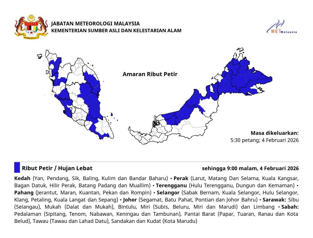 SHAH ALAM, 4 FEB: Ribut petir, hujan lebat dan angin kencang dijangka melanda beberapa kawasan di seluruh negara sehingga jam 9 malam ini, menurut Jabatan Meteorologi Malaysia (METMalaysia).