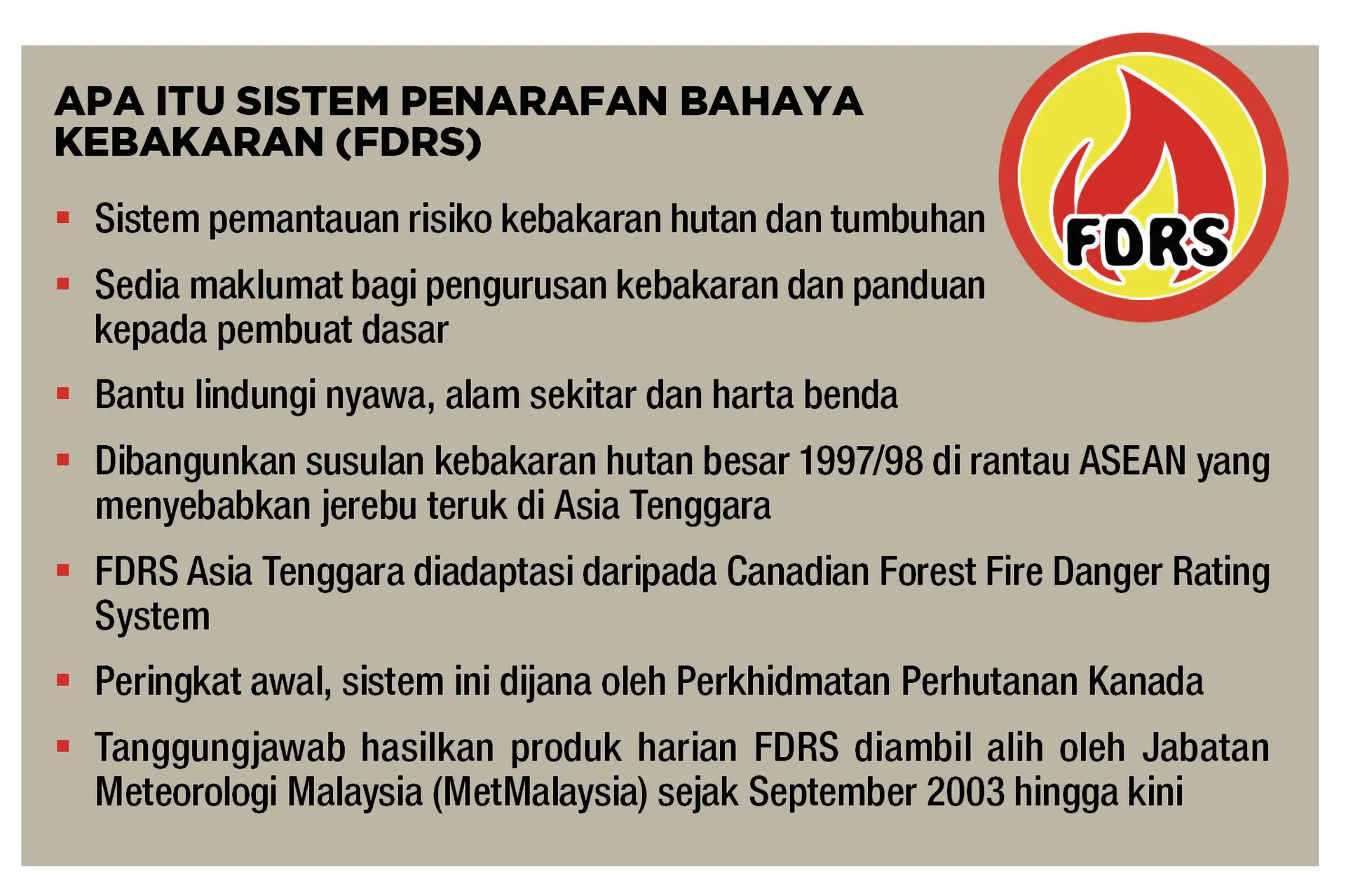 “Indeks-indeks yang dipaparkan dalam FDRS mengandungi maklumat meteorologi dan persekitaran yang penting bagi menilai tahap kemudahan sesuatu kawasan untuk terbakar.