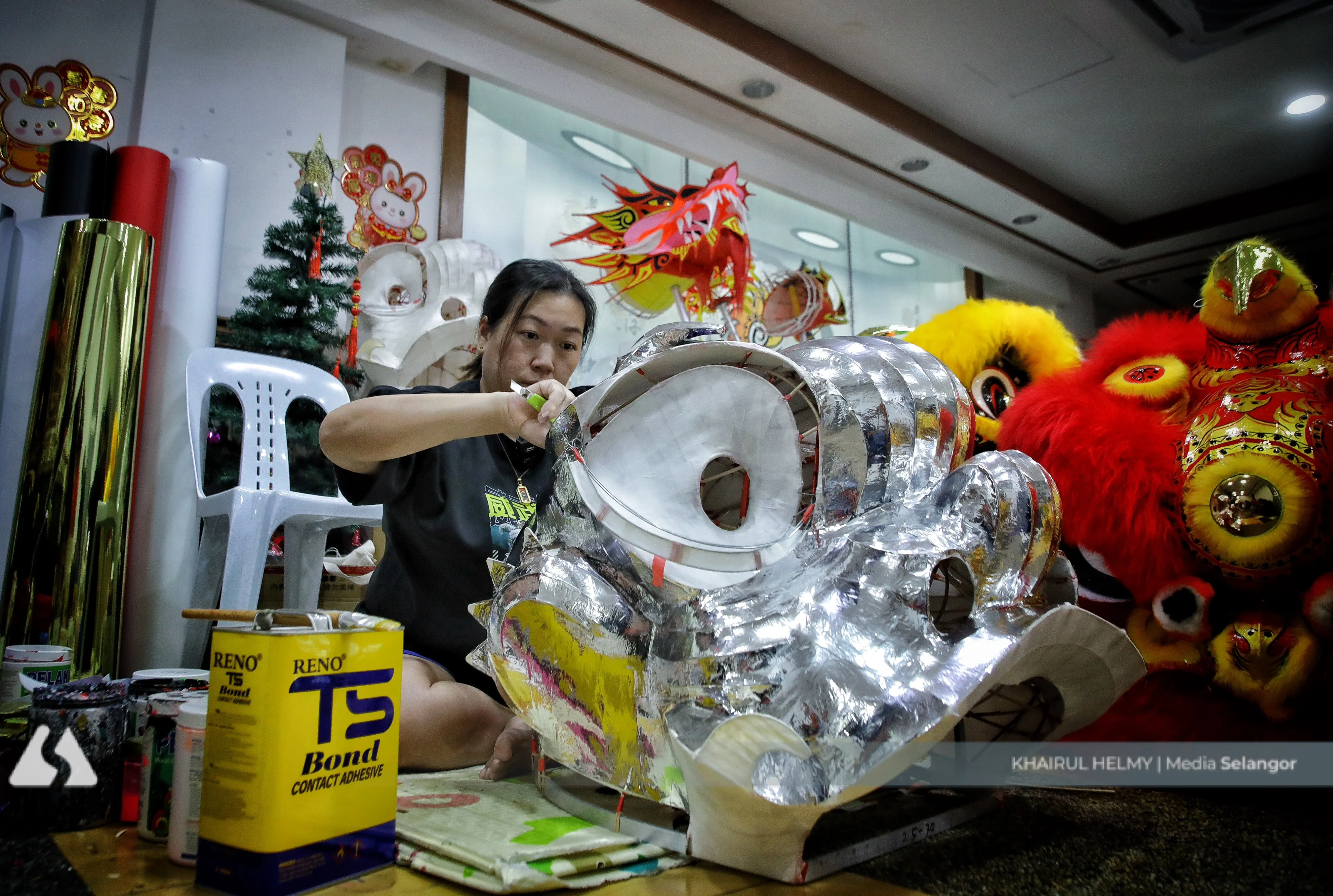 Proses menampal lapisan pelekat di kepala singa mengikut tempahan pelanggan di Lo Fo Chi Enteprise, Kepong.
