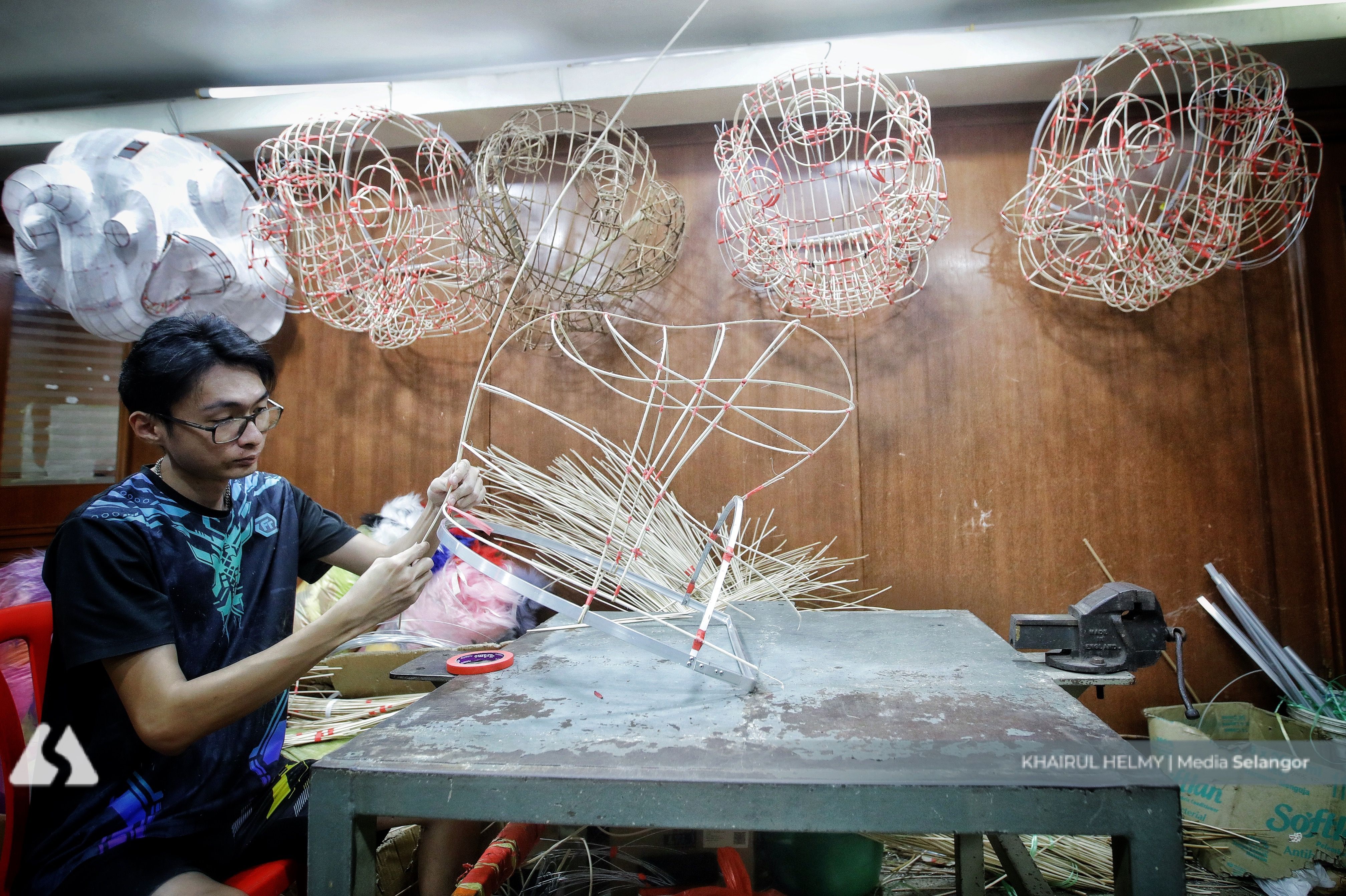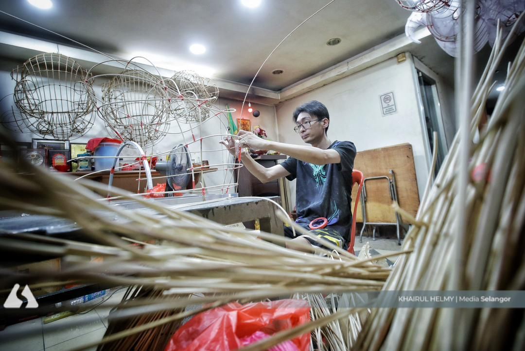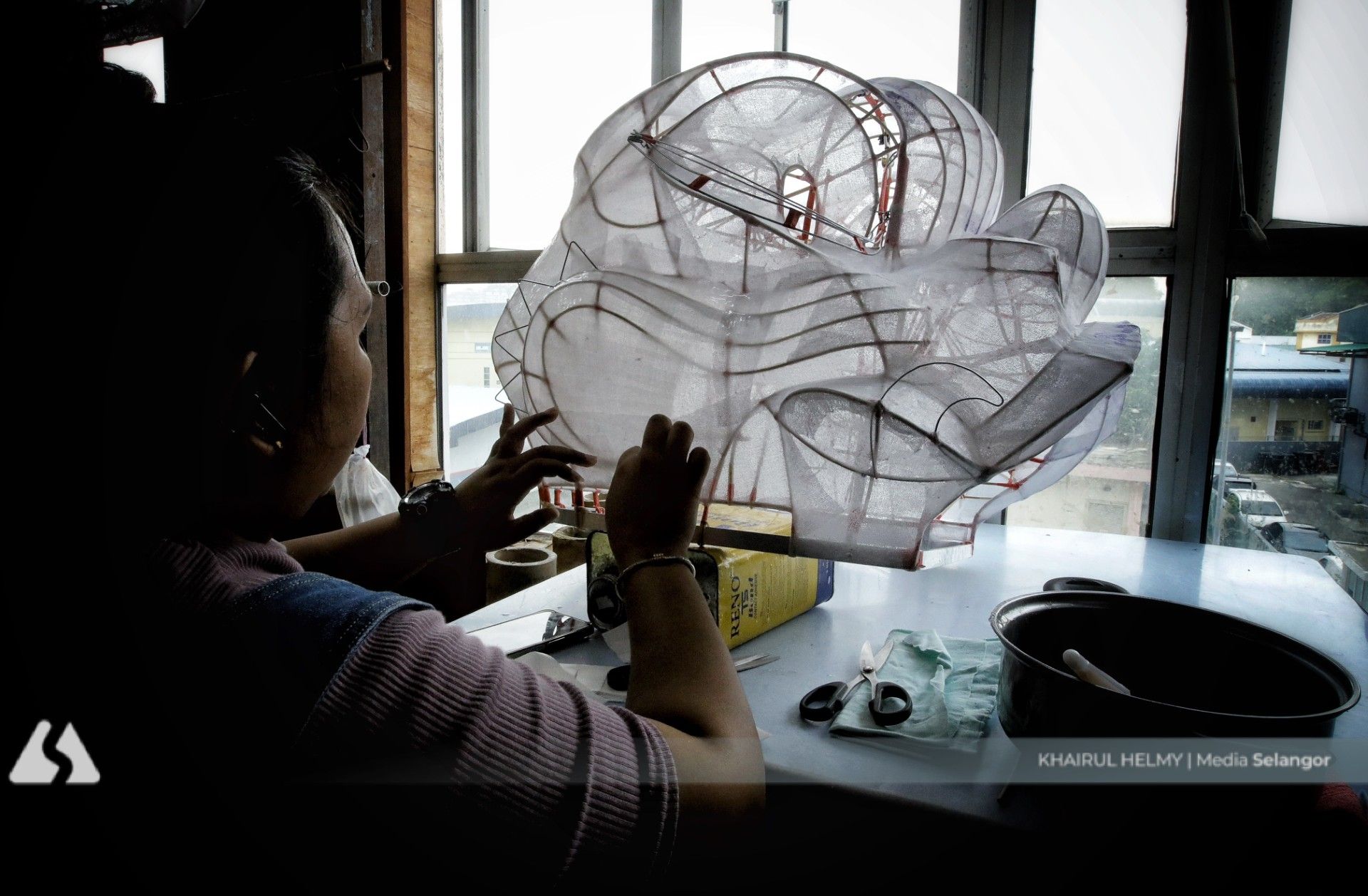 Menampal lapisan kertas di atas rotan antara salah satu proses pembuatan kepala singa di Lo Fo Chi Enteprise, Kepong.