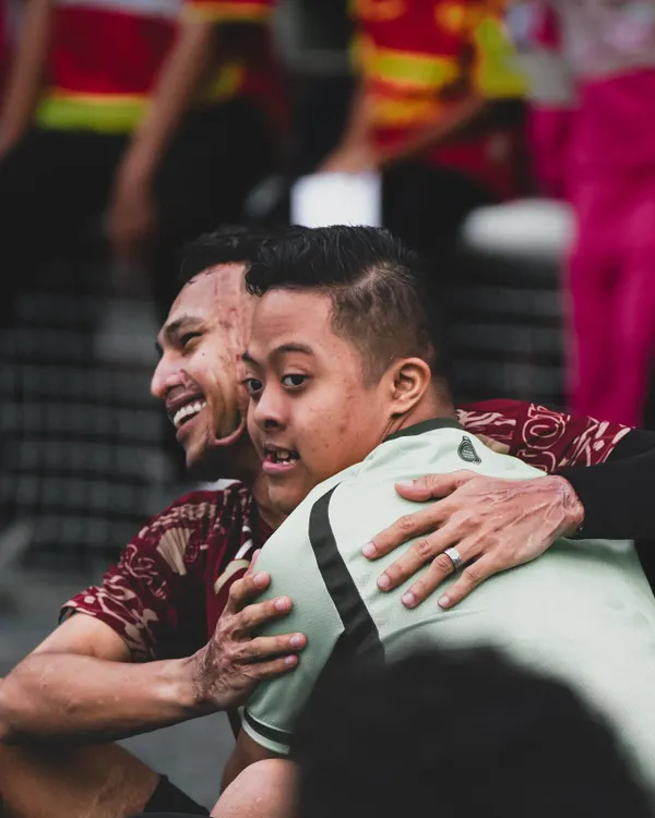 SHAH ALAM, 18 FEB: Detik manis buat remaja Sindrom Down, Aqil Saifullah, 19, apabila berpeluang bertemu dan berpelukan dengan idola bola sepaknya, tonggak Selangor FC, Faisal Halim di Stadium Merdeka baru-baru ini.