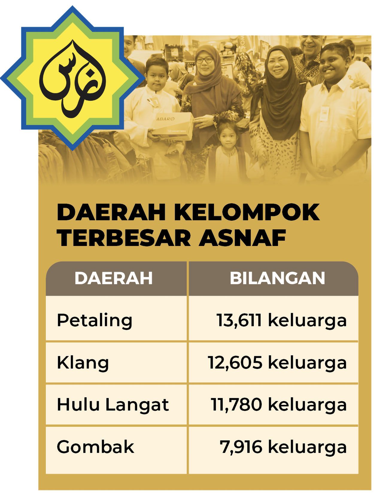 Mengikut data Zakat Selangor kepada Media Selangor, Petaling mencatat bilangan tertinggi iaitu 13,611 keluarga, Klang (12,605 keluarga), Hulu Langat (11,780 keluarga) dan Gombak (7,916 keluarga).
