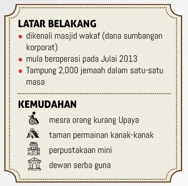 Selain kemudahan tersebut, masjid itu juga menyediakan dewan nikah yang selesa, bilik kuliah dan dewan serba guna yang mampu menampung sehingga 300 jemaah bagi menjalankan pelbagai kegiatan kemasyarakatan.
