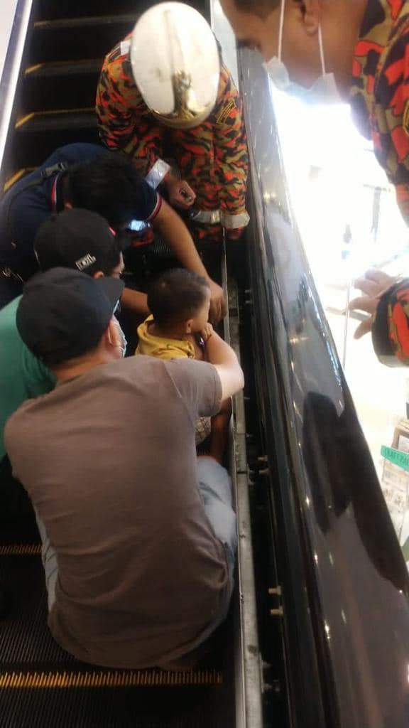 Kejadian berlaku kira-kira 1.30 tengah hari ketika mangsa berusia tiga tahun dikatakan turun bersama ibu bapanya menggunakan eskalator dari tingkat dua sebelum kaki kanannya secara tiba-tiba masuk dan tersepit di bahagian tepi eskalator berkenaan.