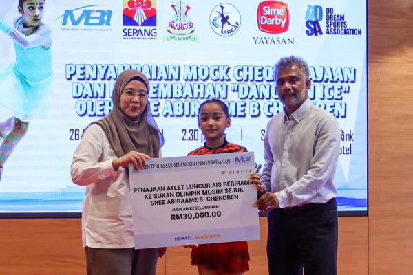 PETALING JAYA, 26 SEPT:  Atlet luncur ais berusia 10 tahun, Sree Abiraame B Chendren menerima tajaan Menteri Besar Selangor (Pemerbadanan) atau MBI berjumlah RM30,000, hari ini.