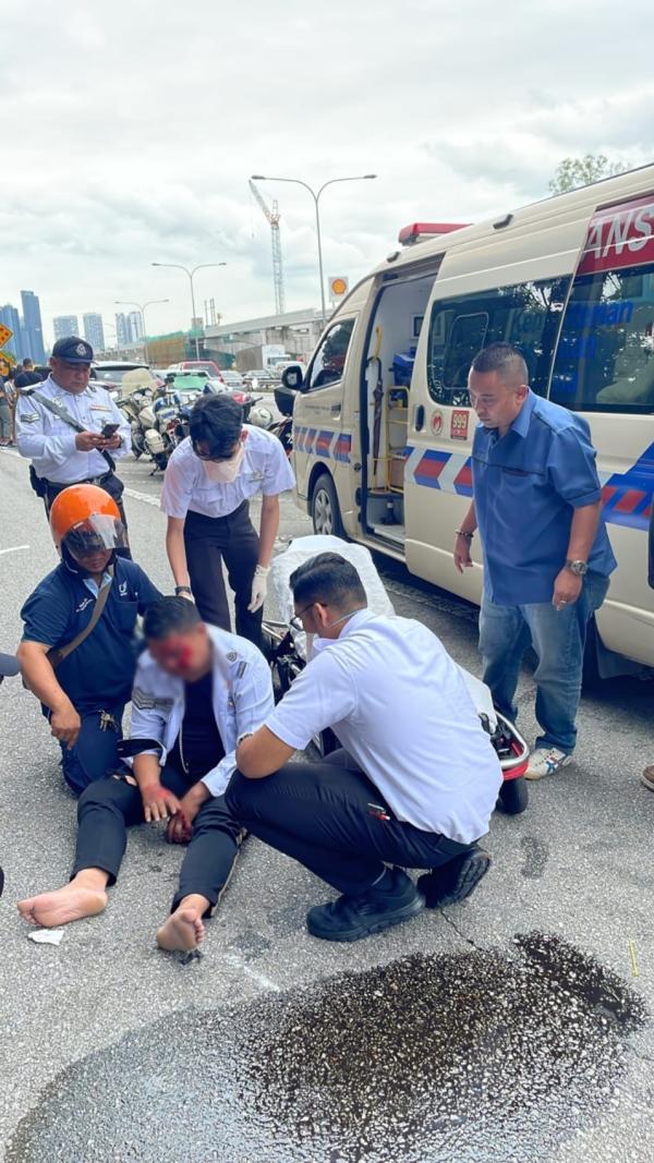 SHAH ALAM, 25 JAN: Seorang anggota polis trafik cedera selepas motosikal ditunggangnya berlanggar dengan sebuah kereta Proton X70 di KM8.9 Lebuhraya Persekutuan arah Shah Alam-Klang di sini hari ini.