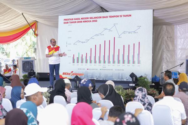 EXCO Infrastruktur & Kemudahan Awam dan Pemodenan Pertanian & Industri Asas Tani, Ir Izham Hashim berucap semasa program Jelajah Kita Selangor Penyayang (JKSP) daerah Sabak Bernam di Pentas Utama Bagan Terap, Sabak Bernam pada 19 Mac 2023. Foto FIKRI YUSOF/SELANGORKINI[/caption]